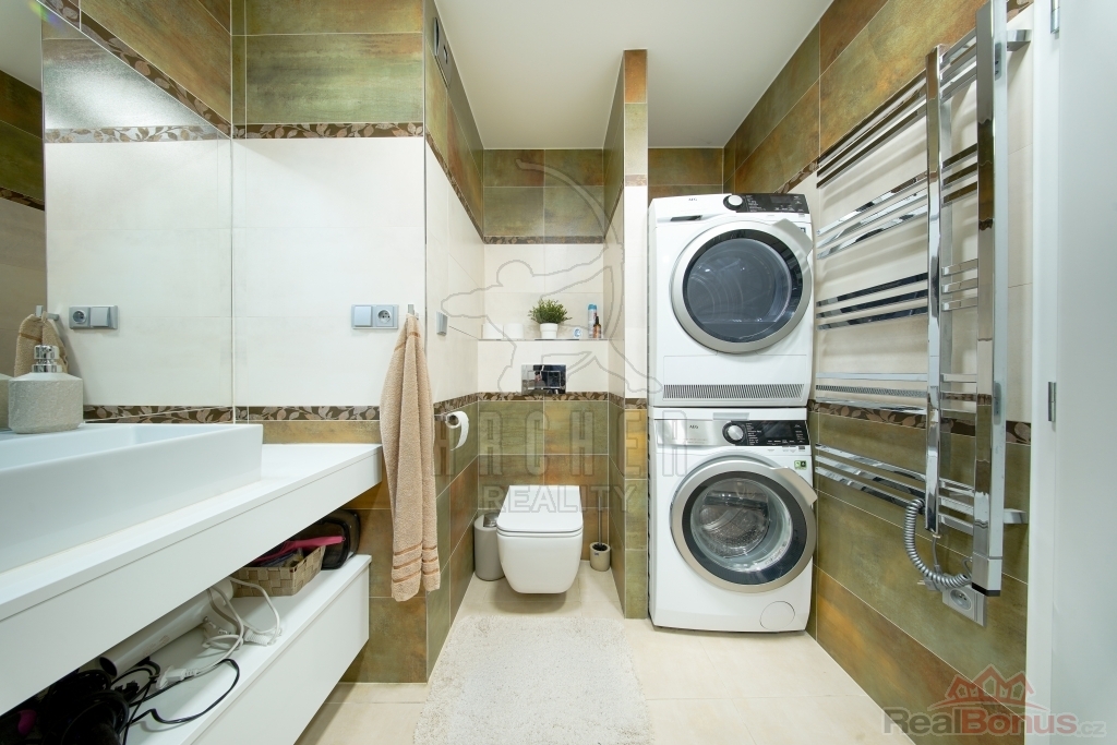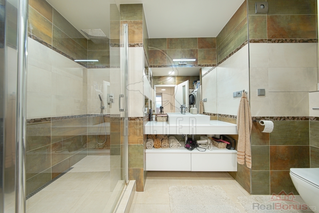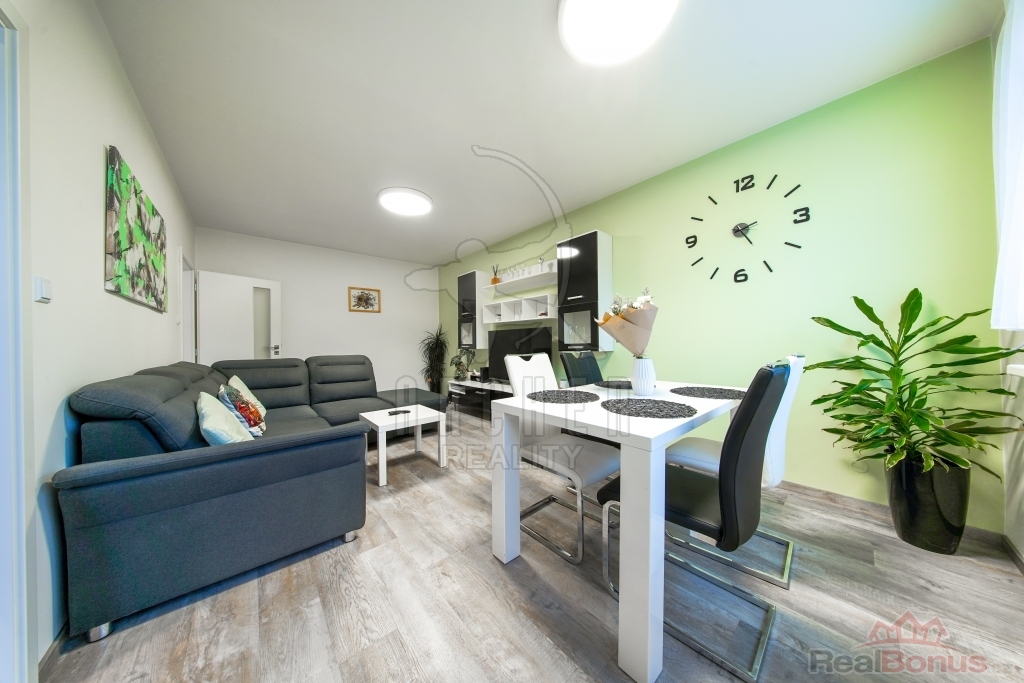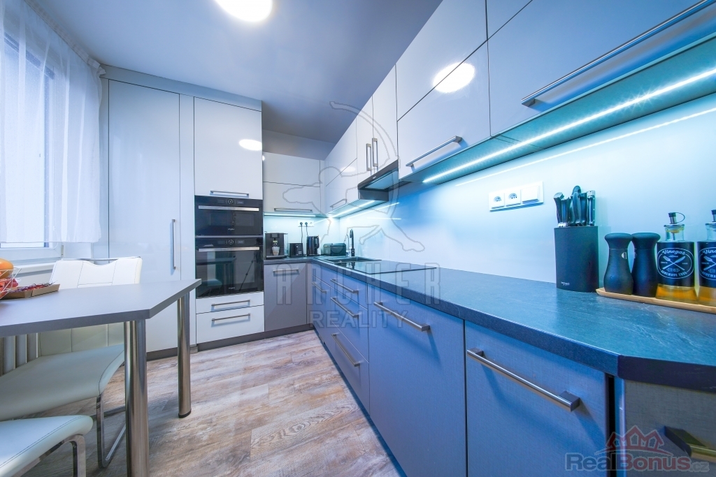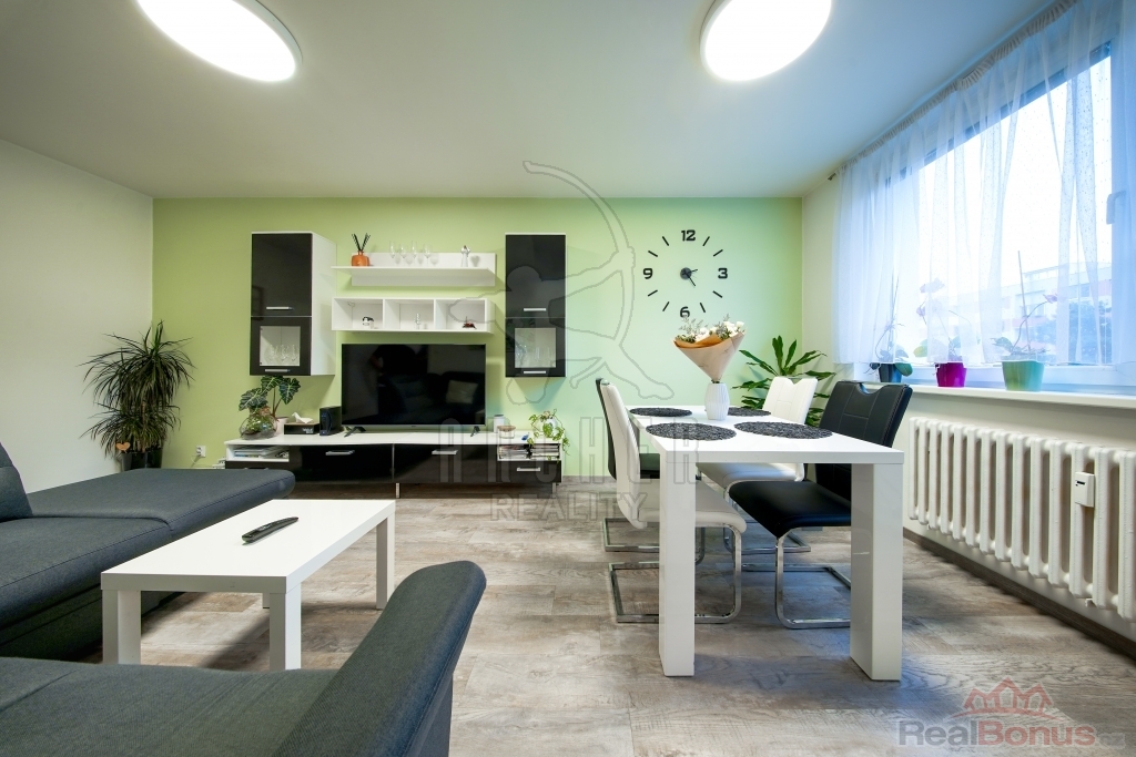 Pokoje jsou otočeny k severovýchodu, směrem k národní přírodní památce Radouč. Větší z pokojů má přístup na 4m2 lodžii s pěkným výhledem do přírody. V předsíni jsou instalovány nové velké vestavné skříně až do stropu. Koupelna s WC a místem na pračku i sušičku má nadstandardně prostorný sprchový kout.