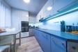 Obývací pokoj s jídelním koutem a kuchyně jsou otočeny k jihovýchodu směrem k ul. Na Radouči. Kuchyně je zařízena na míru a moderně, nechybí ani myčka a indukční varná deska, stejně jako vestavěná trouba a mikrovlnná trouba, linka nabízí dostatek prostoru a potěší chytře promyšlené úložné prostory. I v kuchyni je jídelní kout a vešla se i vysoká lednice. Prostor prosvětluje samostatné okno.