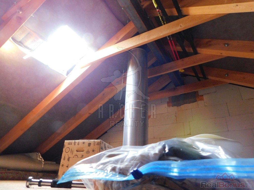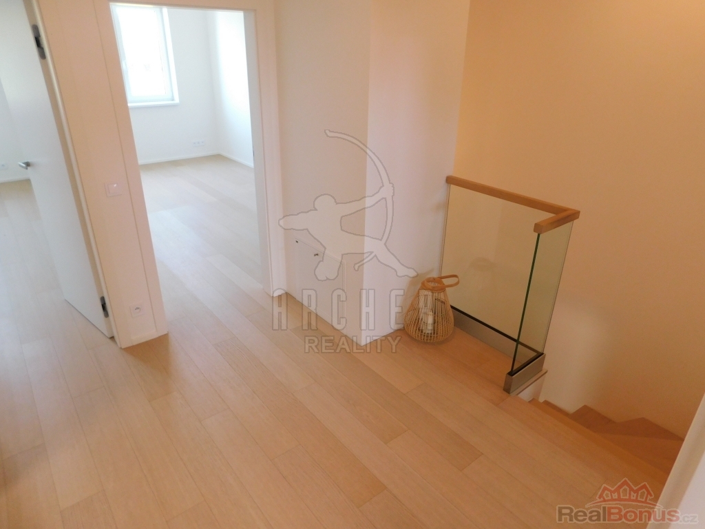 Podlahy jsou z dýhy bez suků a schodiště z bukového dřeva vás dovede do prvního patra, kde se nachází prostorná koupelna s vanou se sprchou a dvěma umyvadly, obložení je velkoformátovými obklady.