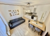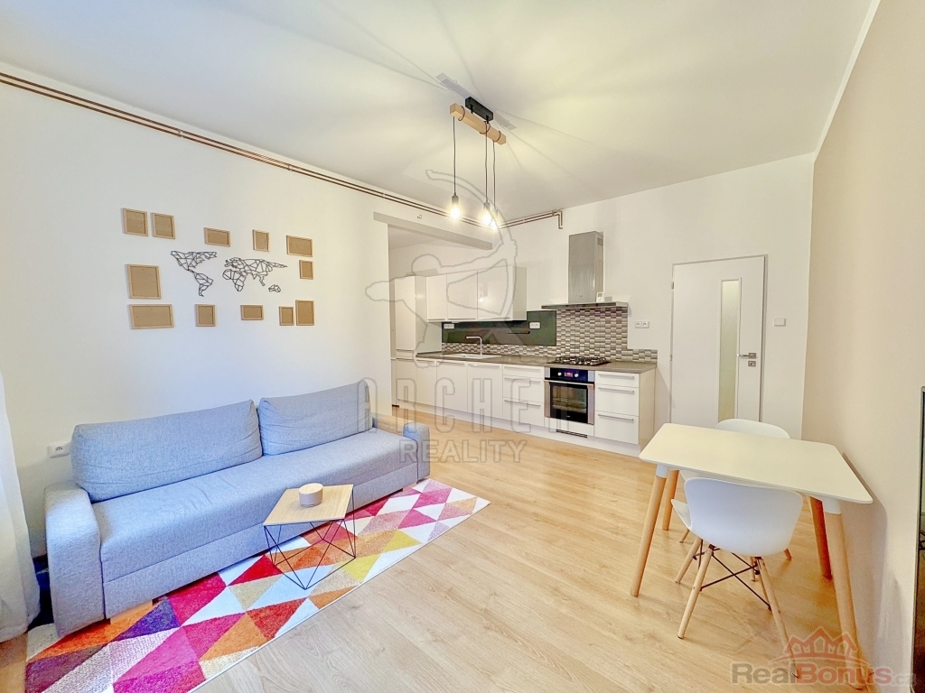 Dominantou bytu je obývací pokoj s přímým vstupem na terasu. Odtud vedou schody na dvorek a do společné zahrady, zcela oddělené od ruchu ulice. Obývací část je propojena s kuchyňským koutem, vybaveným kuchyňskou linkou s vestavěnou horkovzdušnou troubou, plynovou varnou deskou a volně stojící lednicí s mrazákem. Je zde dost prostoru pro umístění jídelního stolu se židlemi, sedací soupravy i obývací stěny s televizí.