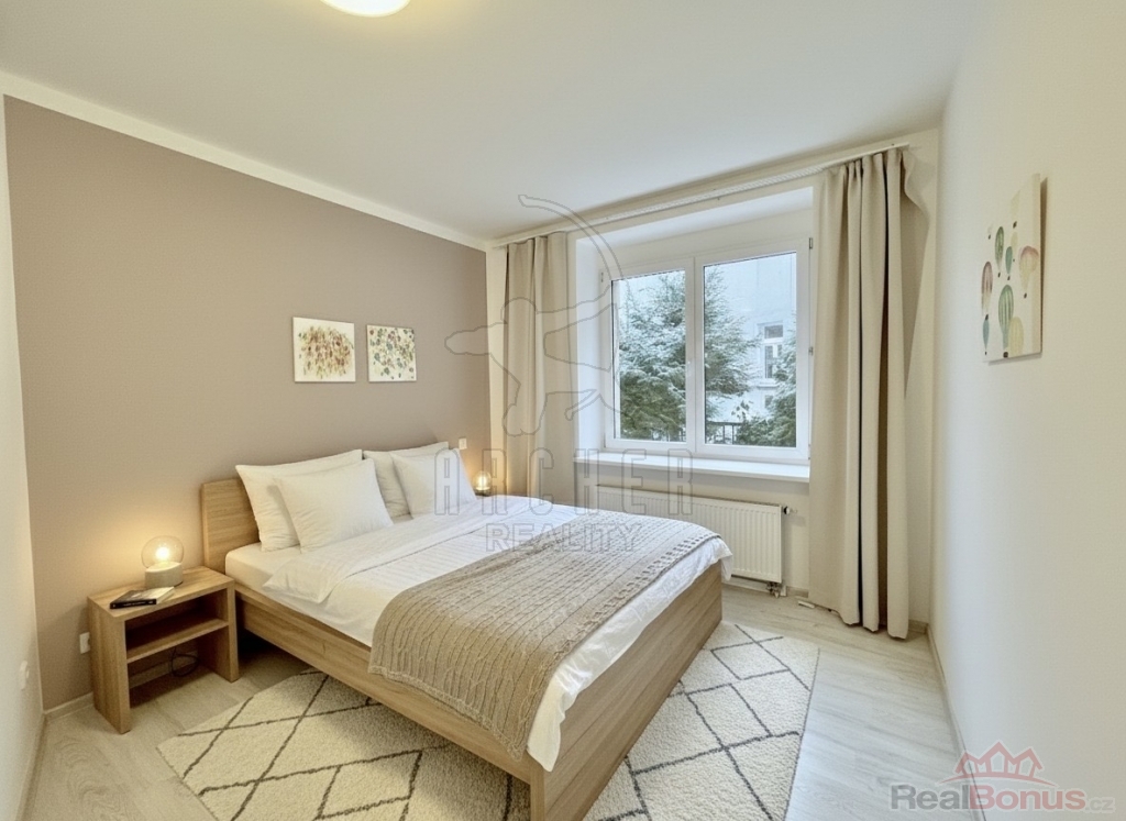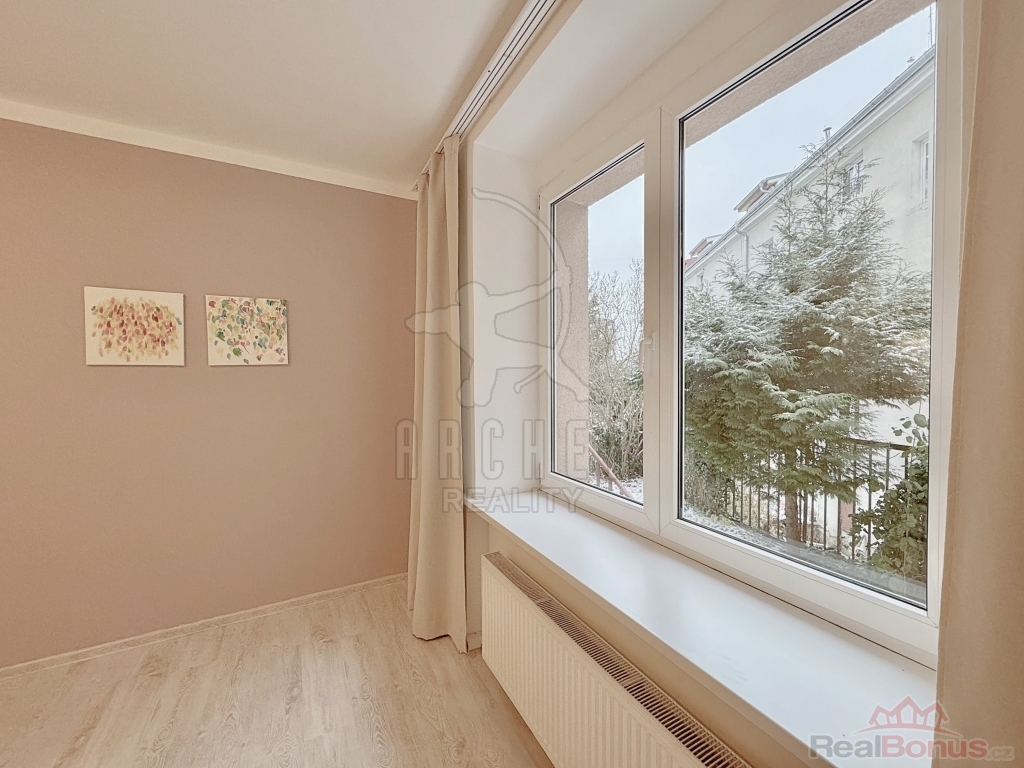 Ložnice je orientována do zeleně vnitrobloku a nabízí dostatek prostoru pro manželskou postel i pracovní kout nebo šatník.