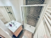 Koupelna je vybavena sprchovým koutem a umyvadlem, toaleta je samostatná. Z obývacího pokoje se vstupuje do prostorné šatny s regály a vestavěnou skříní; v její zadní části je umístěn plynový kotel, zajišťující vytápění a ohřev teplé vody. V předsíni se nachází praktická nika na odkládání svršků. Nad koupelnou a toaletou je k dispozici rozlehlý úložný prostor.