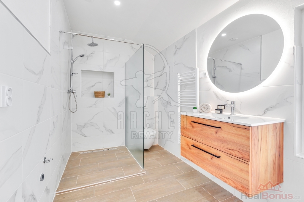 - moderní koupelnu s vanou a vyhřívanou podlahou,
