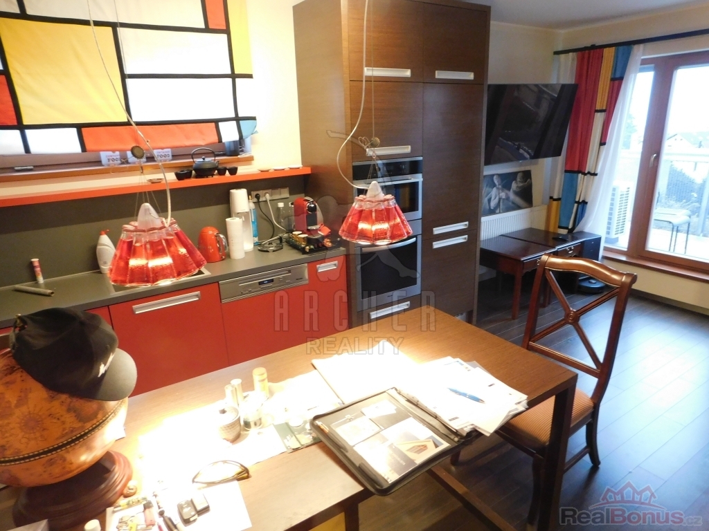 Prostorný obývací pokoj s kuchyňským koutem je orientovaný na jihovýchod a jeho dvě velká francouzská okna umožňují vstup na velkou terasu s krásným, ničím nerušeným výhledem. Zařízení plně vybavené kuchyně je barevně a materiálově sladěno s obývacím pokojem. Mikrovlnná a pečicí trouba značky Miele doplňuje indukční varnou desku, vestavnou myčku a kombinovanou lednici s mrazákem.