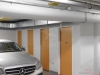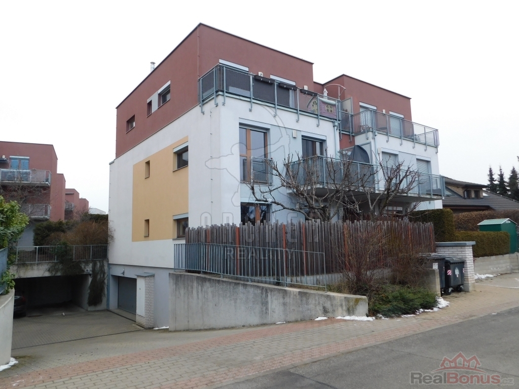 K bytu náleží jedno garážové stání a velký zděný sklep s pevnými regály v prostoru garáží.