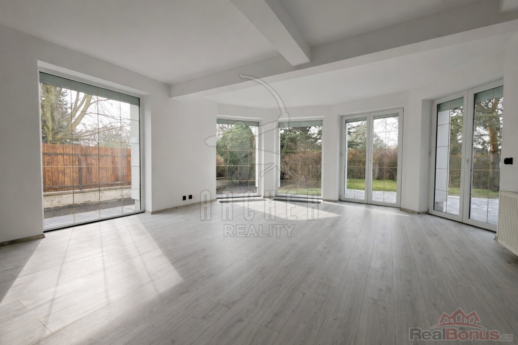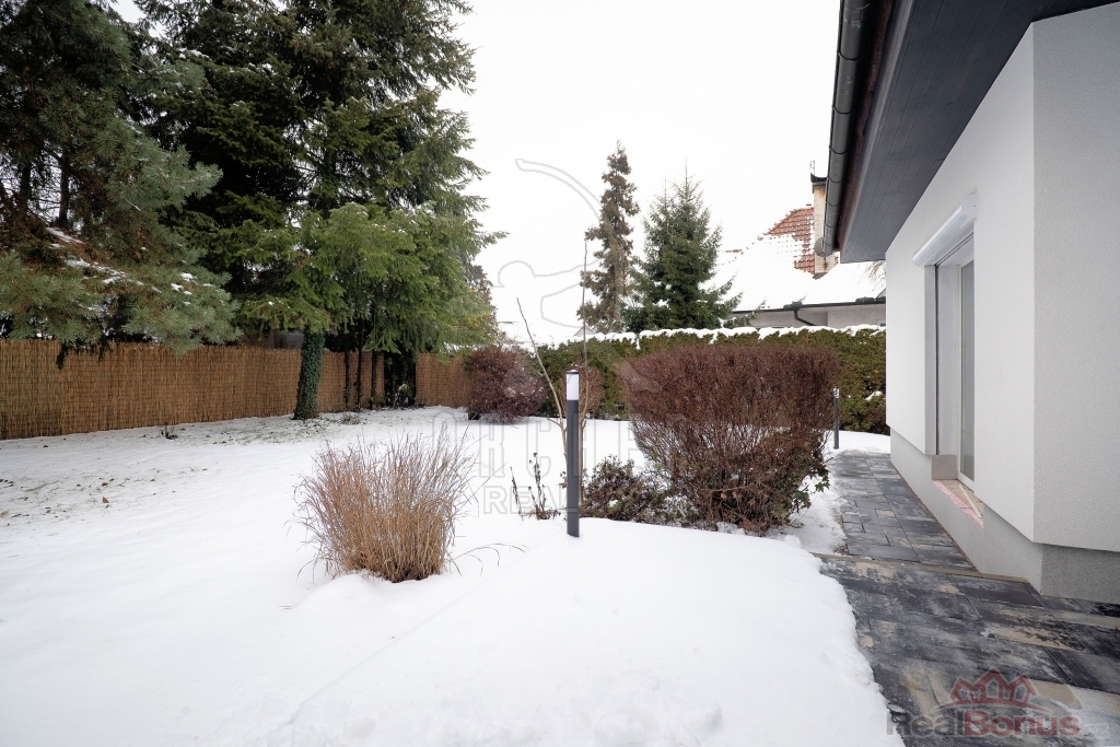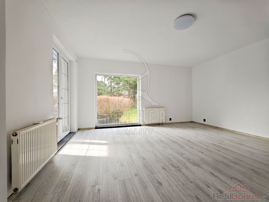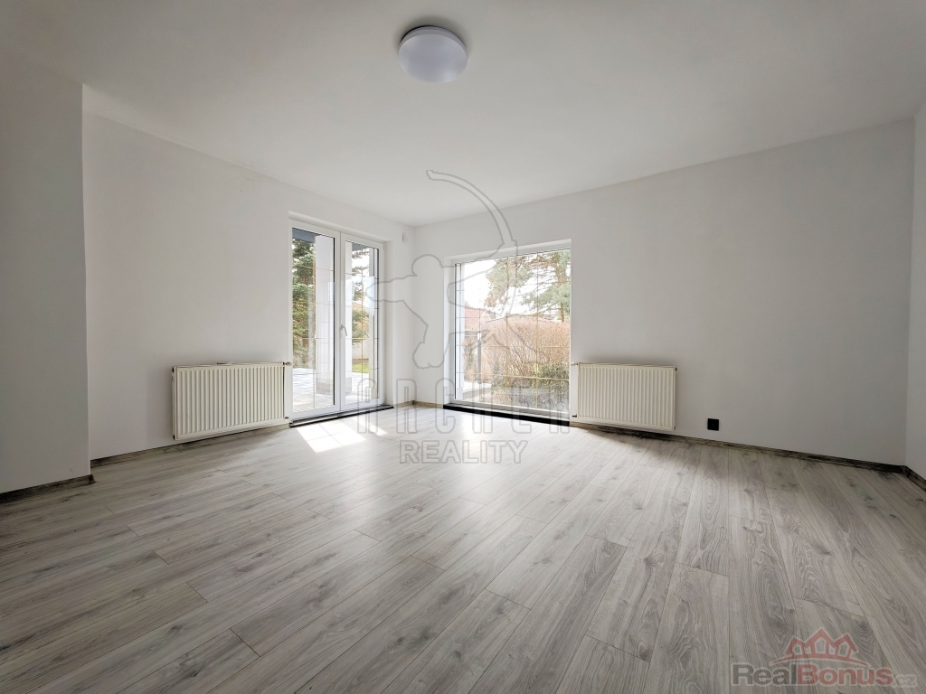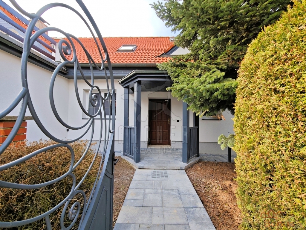 Přízemí nabízí vstupní zádveří, prostornou halu se schodištěm a velkorysý, světlý a klimatizovaný obývací pokoj s velkými okny, dostatkem přirozeného světla a přímým vstupem na udržovanou zahradu s posezením. Součástí je samostatná plně vybavená kuchyň včetně elektrospotřebičů, spíž propojená s garáží, ložnice, pracovna, koupelna se sprchovým koutem a toaletou a technická místnost s elektrokotlem a bojlerem.