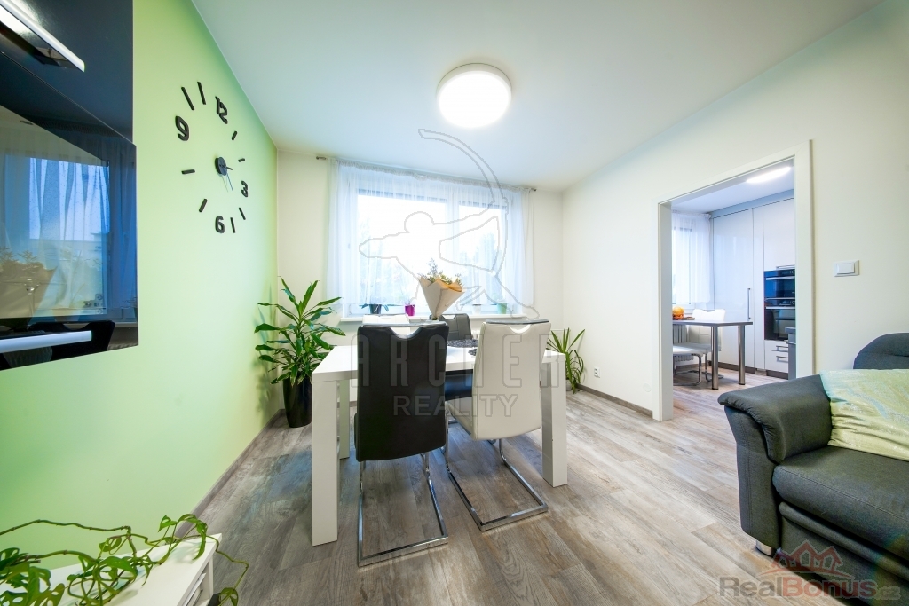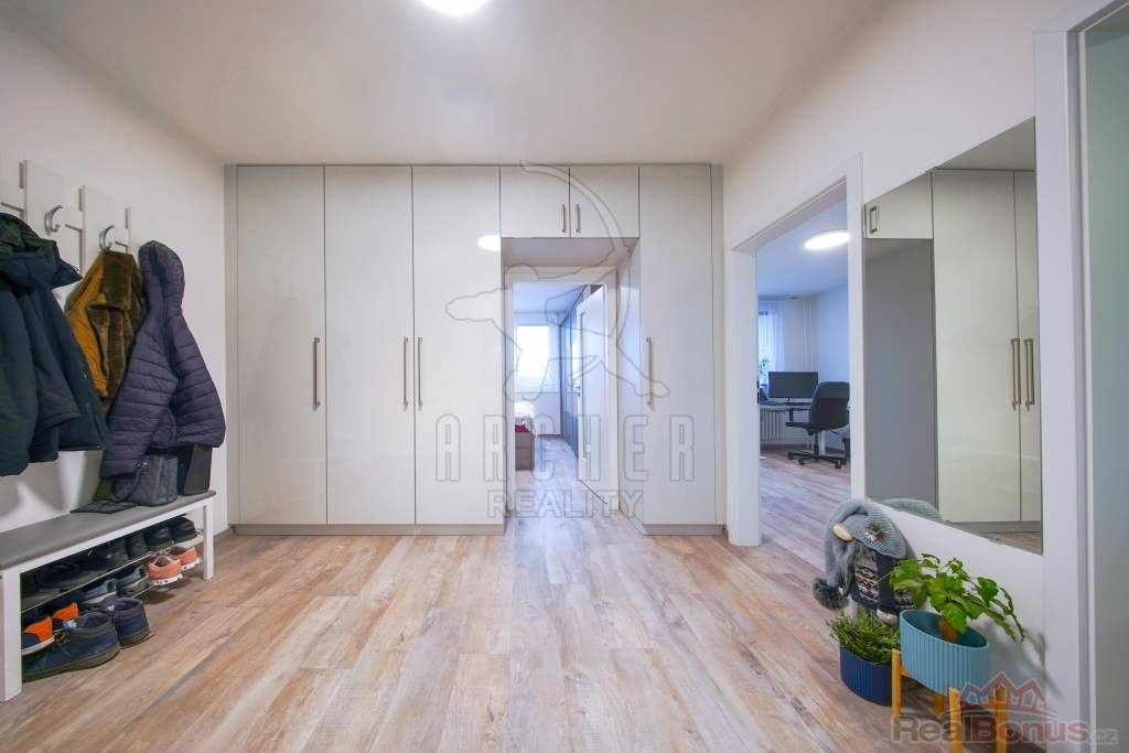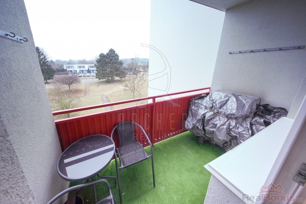 Pokoje jsou otočeny k severovýchodu, směrem k národní přírodní památce Radouč. Větší z pokojů má přístup na 4m2 lodžii s pěkným výhledem do přírody. V předsíni jsou instalovány nové velké vestavné skříně až do stropu. Koupelna s WC a místem na pračku i sušičku má nadstandardně prostorný sprchový kout.