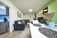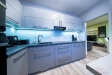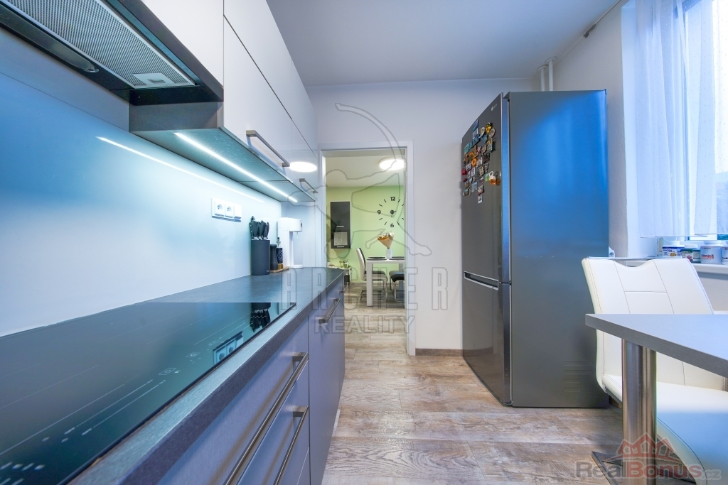 Obývací pokoj s jídelním koutem a kuchyně jsou otočeny k jihovýchodu směrem k ul. Na Radouči. Kuchyně je zařízena na míru a moderně, nechybí ani myčka a indukční varná deska, stejně jako vestavěná trouba a mikrovlnná trouba, linka nabízí dostatek prostoru a potěší chytře promyšlené úložné prostory. I v kuchyni je jídelní kout a vešla se i vysoká lednice. Prostor prosvětluje samostatné okno.