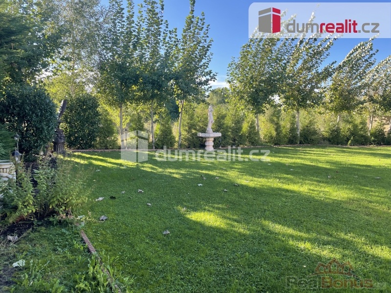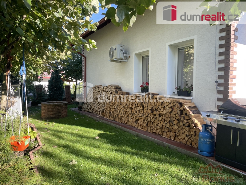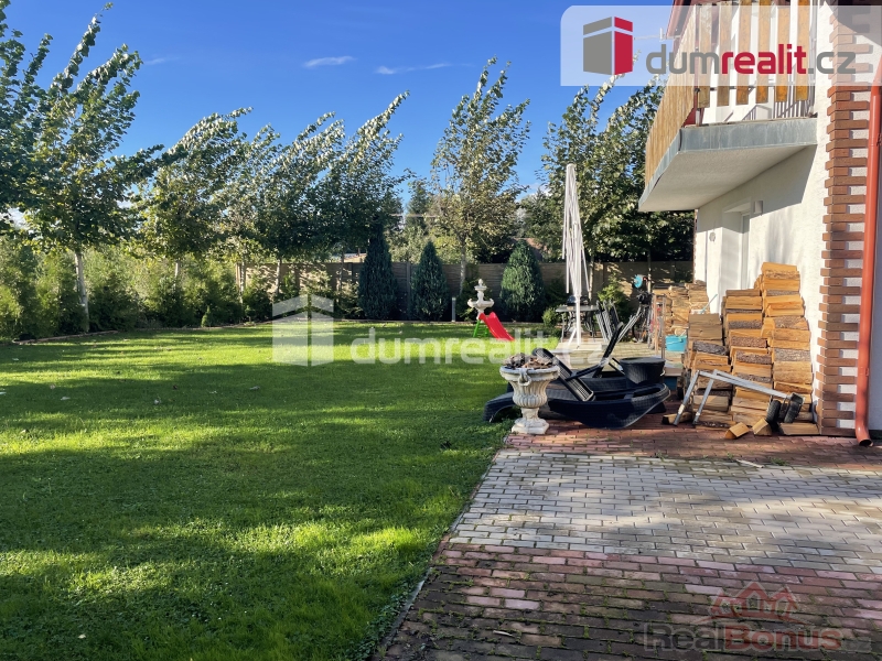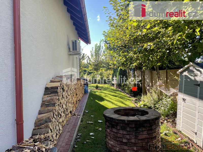 Kolem domu prostorná udržovaná zahrada se zavlažovacím systémem, využívající dešťovou vodu. Součástí prodeje je garáž na dvě osobní vozidla navazující na obytnou část domu s venkovním zastřešeným parkovacím stáním na více osobních vozidel. Celý pozemek oplocen, vstup z obecní komunikace bránou s elektrickým pohonem.