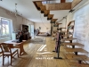 Obývací pokoj: dřevěné podlahy, velká okna zajišťující světlo, otevřené schodiště.