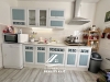 Kuchyňská linka: v rustikálním stylu, plynová varná deska, digestoř, dřez, dostatek úložných prostor, obklad stěn, a plovoucí podlaha v dekoru dřeva.