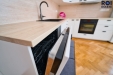Kuchyňská linka v příjemných barvách, vybavená standardními spotřebiči.