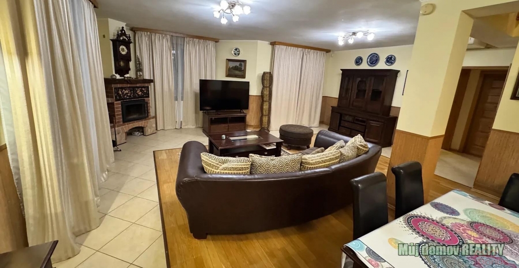 prostorný obývací pokoj s jídelní částí, krbem a vstupem na terasu
