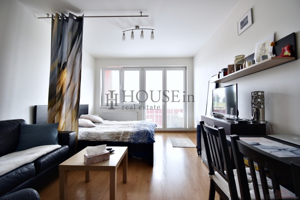 Dispozice bytu zahrnuje předsíň, koupelnu se sprchovým koutem a toaletou, a světlý obytný pokoj s kuchyňskou linkou a vstupem na balkón. Byt je kompletně vybaven nábytkem a spotřebiči ? k dispozici je lednice, elektrická trouba, varná deska, digestoř, pračka i televize.