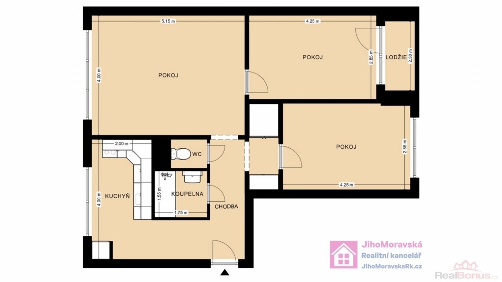 Dispozice bytu: předsíň, chodba, kuchyň, koupelna (vana, připojení na pračku), toaleta, jeden samostatný pokoj a dva průchozí pokoje a lodžie. V 1. podzemním podlaží bytového domu je umístěna sklepní kóje. Půdorys bytu naleznete ve fotogalerii.