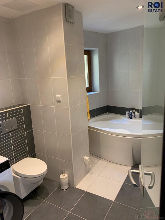 * koupelna s vanou, toaletou a pračkou