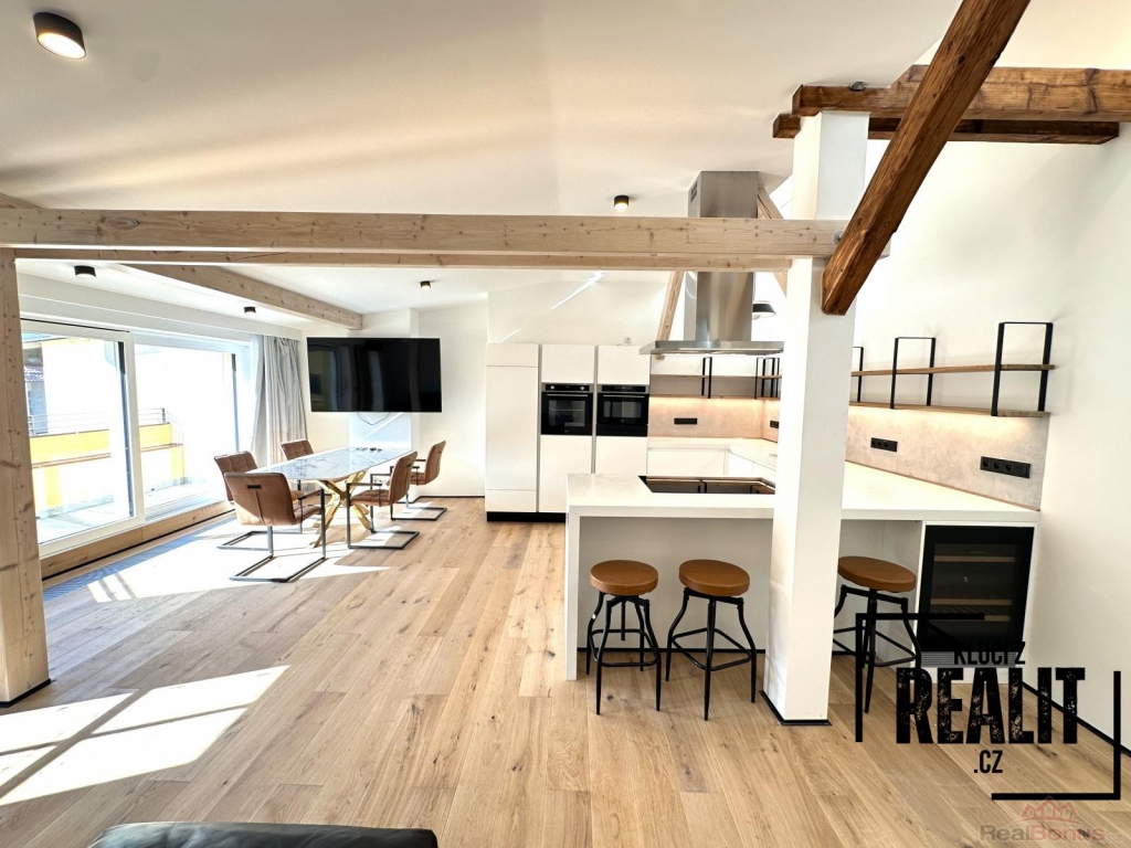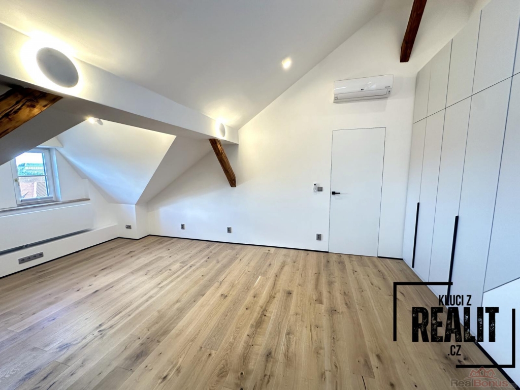 K dlouhodobému pronájmu nabízíme plně klimatizovaný podkrovní byt s terasou a nadstandartním vybavením o dispozici 4+kk a výměrou 136 m2, situovaný ve 4. patře historického domu s výtahem v prestižní lokalitě Malé Strany, v ulici Újezd.