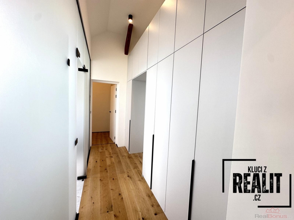 Ze vstupní chodby je přístup do technické místnosti, dětského pokoje, koupelny se sprchovým koutem s infračerveným světlem a bidetovým záchodem pro hosty a obývacího pokoje s prostornou a vybavenou kuchyňskou linkou a přístupem na terasu, která směřuje do klidného vnitrobloku s výhledem na vrch Petřín. Kuchyň je vybavena myčkou, troubou, indukčním vařičem, lednicí, mrazákem, mikrovlnou troubou, vinotékou a ohřívačem talířů.