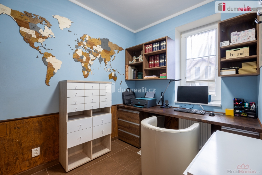 V patře jsou tři pokoje, koupelna a technická místnost s kotlem. Z ložnice a koupelny se dá vstoupit na balkon, který je situován do ulice.
