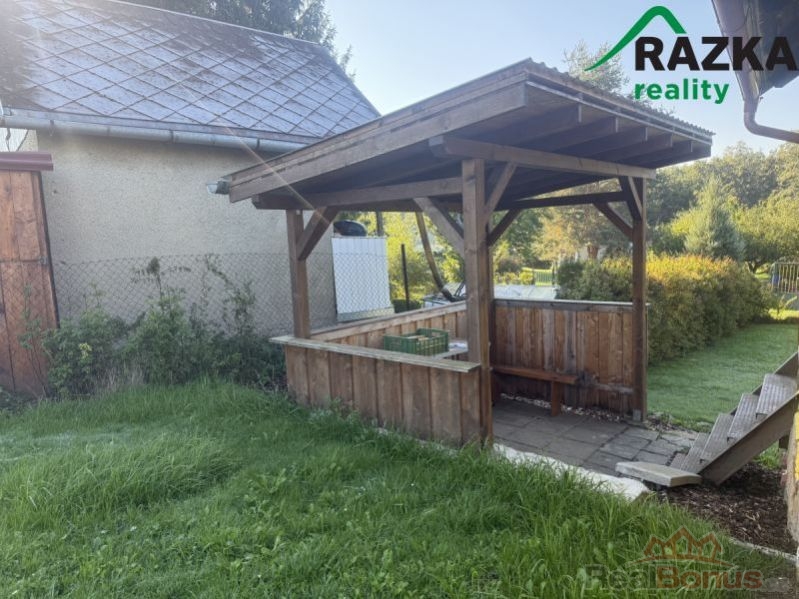 Na pozemku stojí dřevěná chatka se zasklenou verandou a praktickým skladovým prostorem, která poskytuje ideální zázemí pro víkendový odpočinek nebo zahrádkářské využití. K dispozici je také dřevěná pergola.