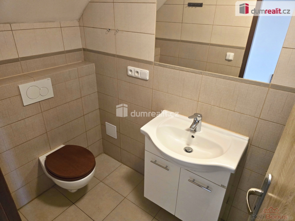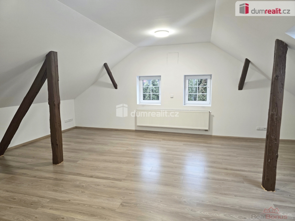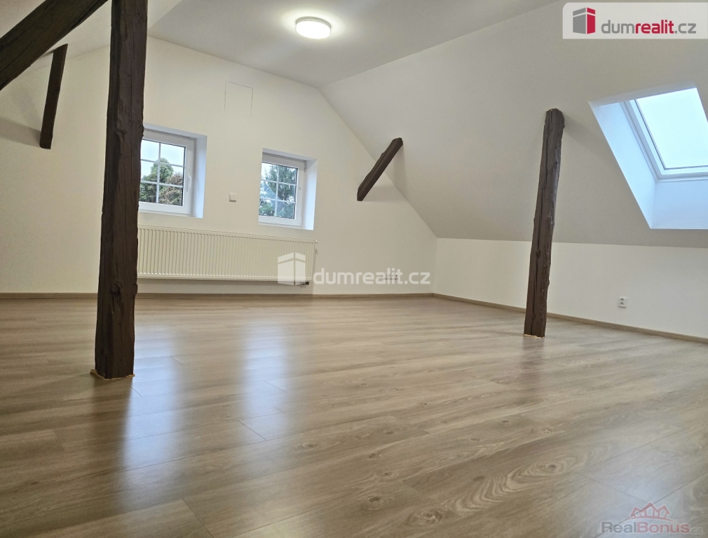 V patře je jedna velká místnost vhodná jako velký obývací pokoj nebo ložnice. Po celém domě jsou nové plovoucí podlahy,keramická dlažba, nová plastová okna se žaluziemi. Za domem je zahrada s menší terasou.
