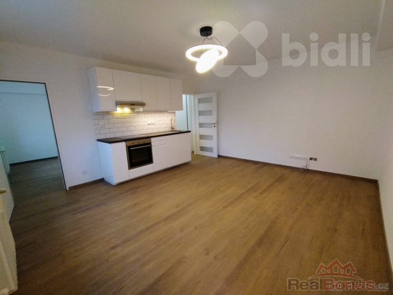 Buďte první nájemce po rekonstrukci. Obývací pokoj s novou kuchyňskou linkou a myčkou, elektrická horkovzdušnou troubou, indukční varná deská a digestoří.