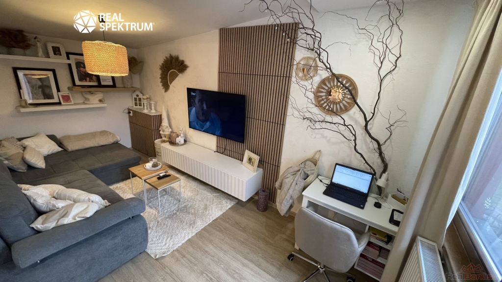 V přízemí domu se nachází moderní koupelna s vanou a prostorný, otevřený koncept kuchyně s obývacím pokojem. Celý prostor je velmi světlý, vzdušný a působí útulným dojmem. V patře jsou situovány dva samostatné pokoje a balkon, ze kterého si můžete vychutnat krásné výhledy do krajiny.