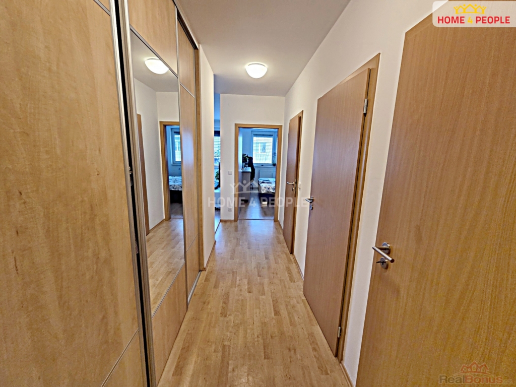 Dispozice bytu zahrnuje světlý obývací pokoj s kuchyňským koutem, samostatnou ložnici, prostornou koupelnu a předsíň s vestavěnou skříní. Kuchyňská linka je vybavena vestavěnými spotřebiči elektrická varná deska, trouba, lednice s mrazákem a myčka na nádobí.