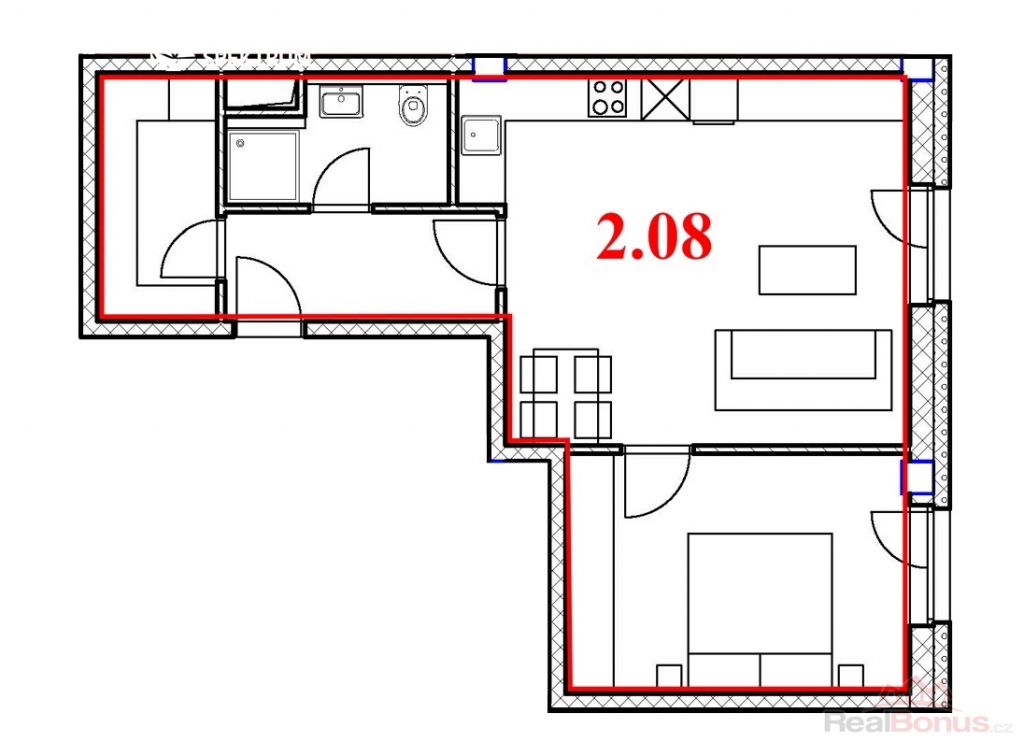 Dispozice: vstupní chodba (4,6 m2), obývací pokoj s kuchyňským koutem (24,4 m2), pokoj (12,9 m2), koupelna s WC (3,7 m2), komora (4,7 m2)