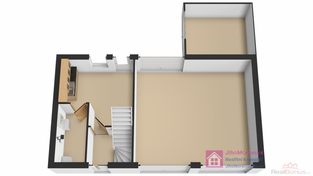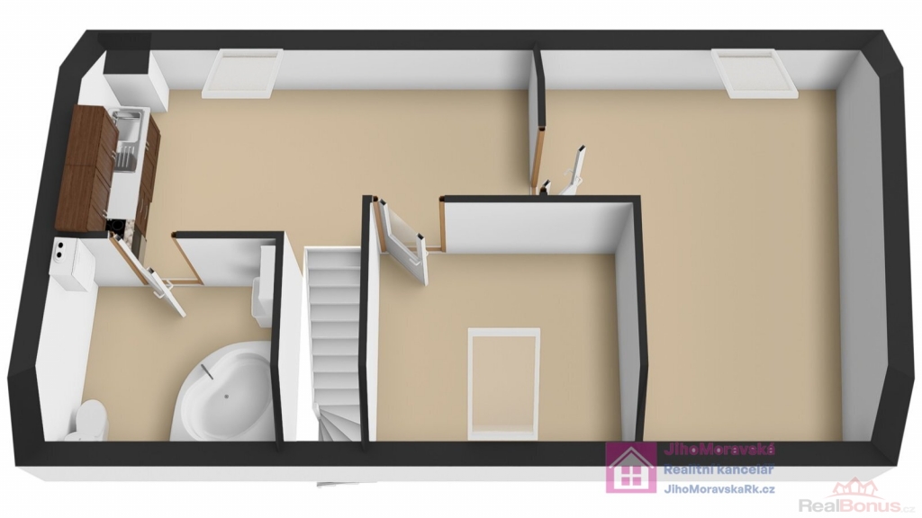 2. nadzemní podlaží: schodiště, koupelna (rohová vana) s toaletou, kuchyň s jídelnou a dva samostatné pokoje. Půdorys celého domu naleznete ve fotogalerii.