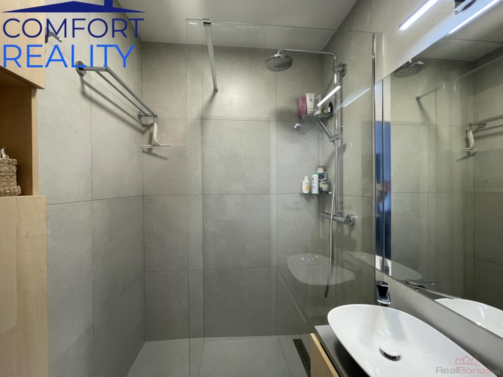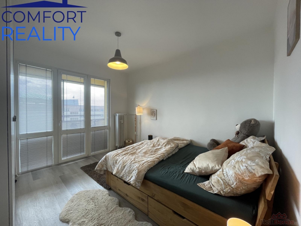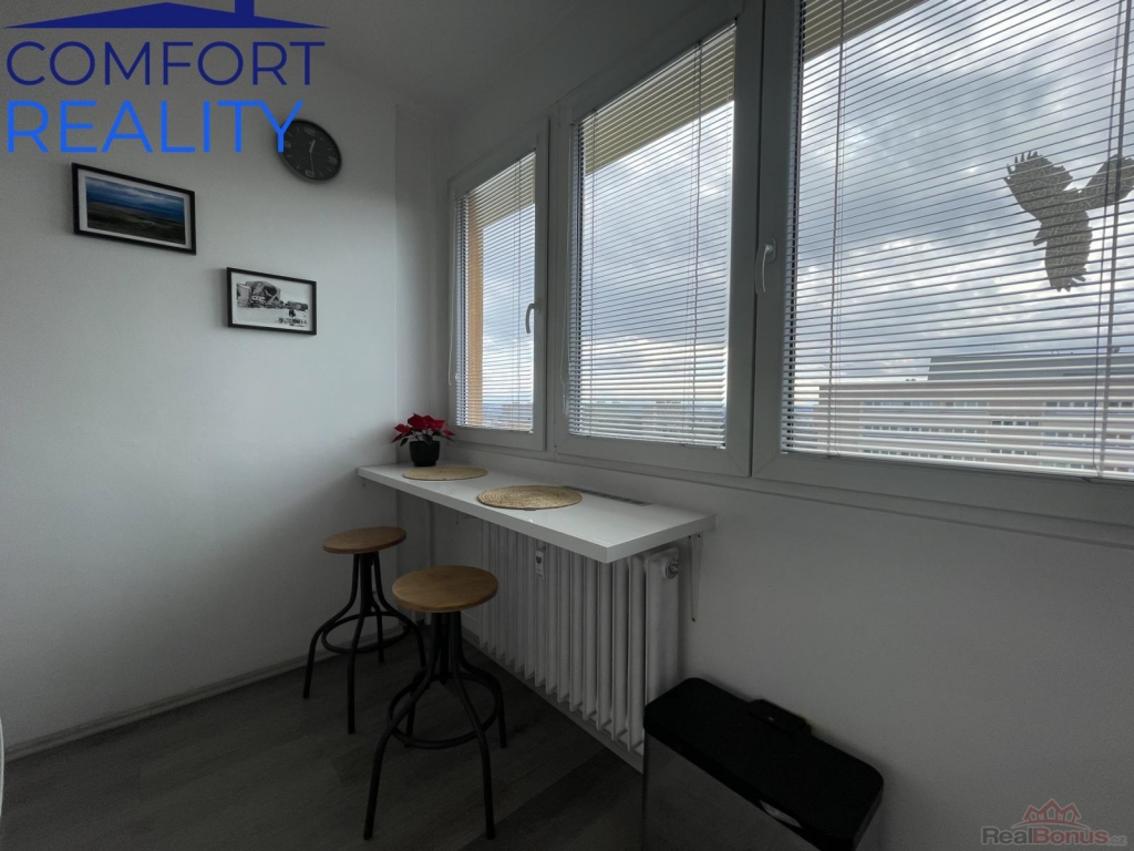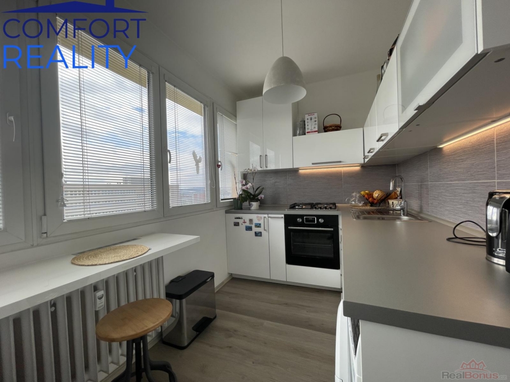 Interiér prošel před třemi lety velmi vkusnou modernizací. Vyzděné bytové jádro ukrývá koupelnu se sprchovým koutem, kuchyně je osazena atraktivní linkou s vestavnými spotřebiči a celým prostorem prochází sjednocená vinylová podlaha. Promyšlené úložné prostory v předsíni zajišťuje prostorná šatní skříň na míru. Díky jižní orientaci je byt po celý den zalitý sluncem a působí velmi útulně.