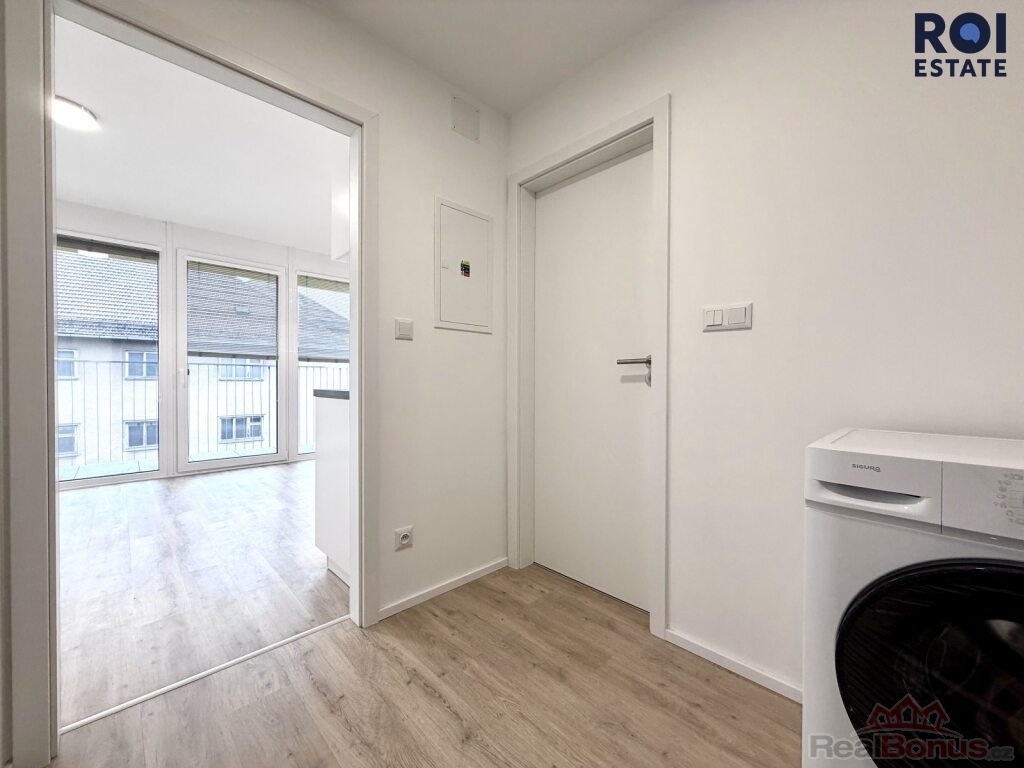 Byt nabízí vstupní předsíň s prostorem pro šatní řešení, moderní koupelnu se sprchovým koutem a hlavní obytný prostor s kuchyňskou linkou vybavenou elektrickou varnou deskou, troubou, lednicí a pračkou.