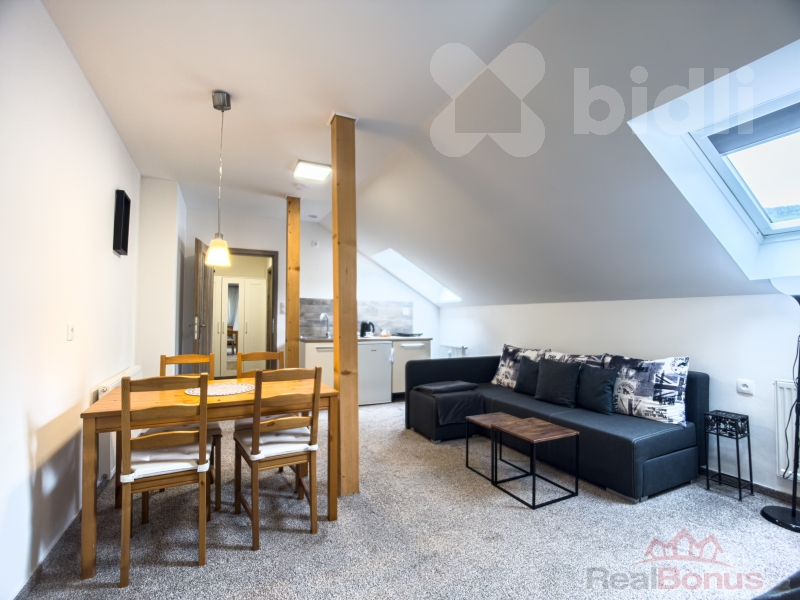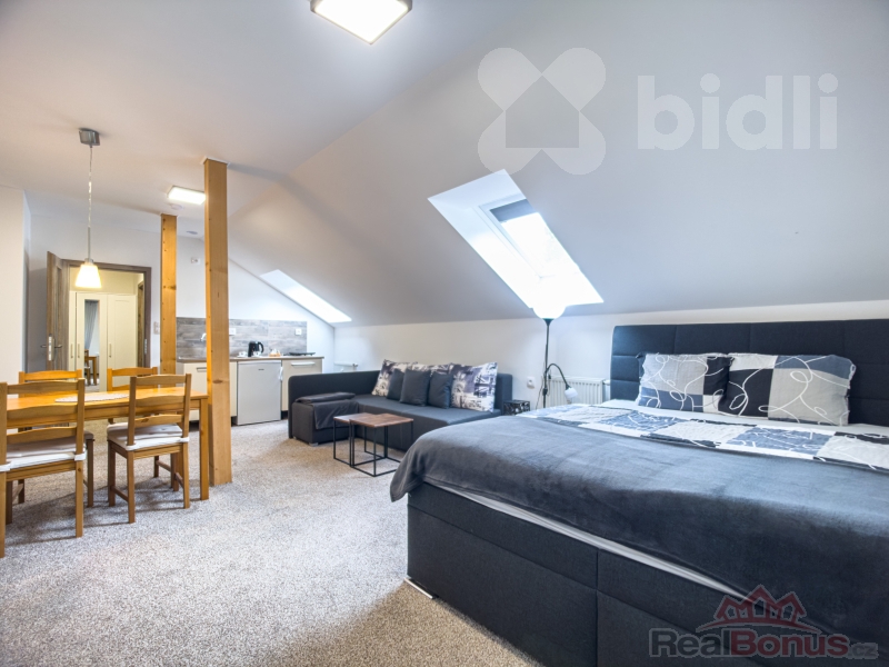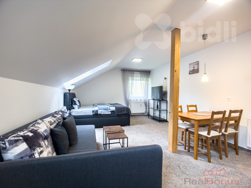 Dovoluje si Vám nabídnout podkrovní apartmán 1+kk v 1NP. Na katastru vedeno jako stavba občanského vybavení. Budova je celá nově zrekonstruována. Apartmán je plně vybavený a připravený k okamžitému rekreování nebo nastěhování. V prostorném hlavním pokoji je obytná část, kde se vejde dvojpostel, rohová sedací souprava, konferenční stůl a televizní stolek, kuchyňský kout s lednicí a s jídelnou, kde je i jídelní stůl pro čtyři osoby. Na chodbě je skříň s trezorem a z chodby je vstup na samostatnou toaletu a vstup do koupelny se sprchovým koutem. Topení a ohřev vody zajišťuje pro každé patro plynový kotel. Ve sklepě je prostorná zděná sklepní kóje kde je možný i přístup zadním vchodem (lze zde mít kolo, kočárek... ). K apartmánu patří k užívání parkovací místo a posezení pro pod venkovní zastřešenou pergolou , kde je moznost i grilování. Jeseník je lázeňské město v srdci Jeseníků, kde je mnoho možností k rekreaci i aktivnímu sportu po celý rok. Kromě možnosti turistiky v atraktivním prostředí Jeseníků a blízkých Rychlebských hor jsou poblíž lyžařské areály Ramzová a Červenohorské sedlo. V okolí se také nachází lázeňské městečko Lipová, Branná s krásným okolím, Javorník se zámkem, Zlaté hory. V samotném Jeseníku se nachází krásné venkovní koupaliště. Skvělá investiční příležitost i na krátkodobý pronájem.