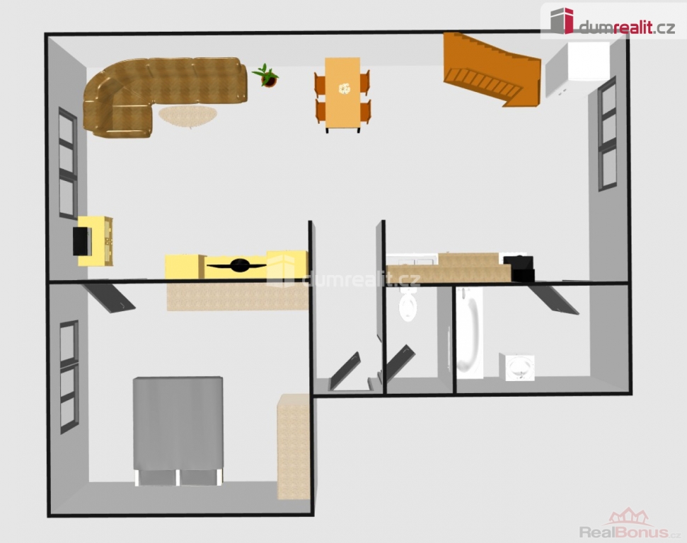 Dispozičně je byt řešen následovně: zádveří, samostatné WC, koupelna, kuchyně 16,5m, obývací pokoj 17m, ložnice 15m, dále se schodištěm z kuchyně přijde do podkroví, které disponuje centrální chodbičkou s klimatizací, pokojem 15m, pokojem 16m, šatnou či technickou místností 8m, koupelnou se sprchovým koutem a samostatným WC.