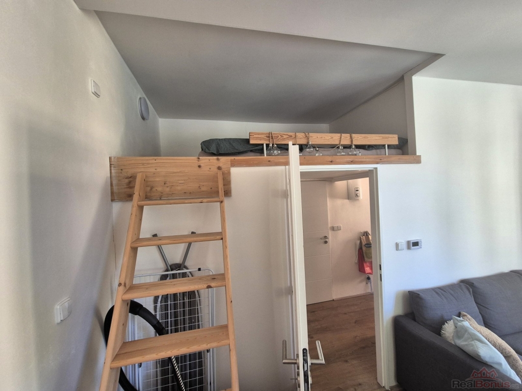 Hlavní obytná místnost: Prostorný pokoj s vysokými stropy a velkými okny, které zajišťují dostatek denního světla. Praktické vyvýšené spaní, které slouží jako plnohodnotné dvoulůžko a šetří tak cenný prostor. V pokoji zůstává velká šatní skříň, TV stolek a jídelní stůl se židlemi. Upozornění: Sedací souprava (gauč) není součástí pronájmu.