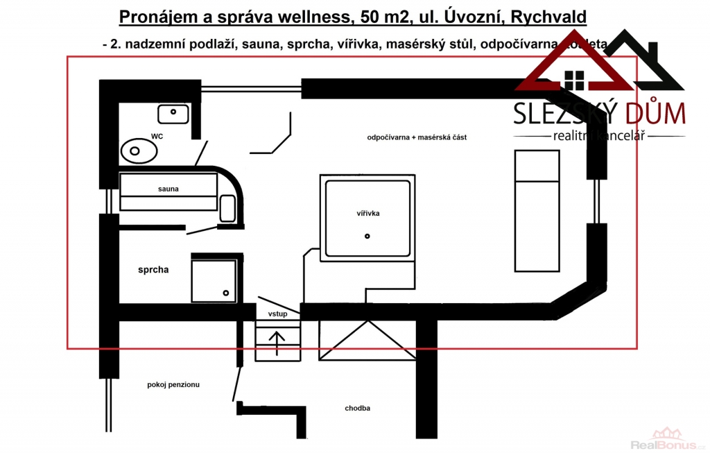 Nabízíme k pronájmu kompletně vybavené komerční prostory - wellness o velikosti 50 m2 v multifunkčním objektu Penzionu SILMA v obci Rychvald. Prostory se nachází ve 2. nadzemním podlaží s přístupem přes penzion.