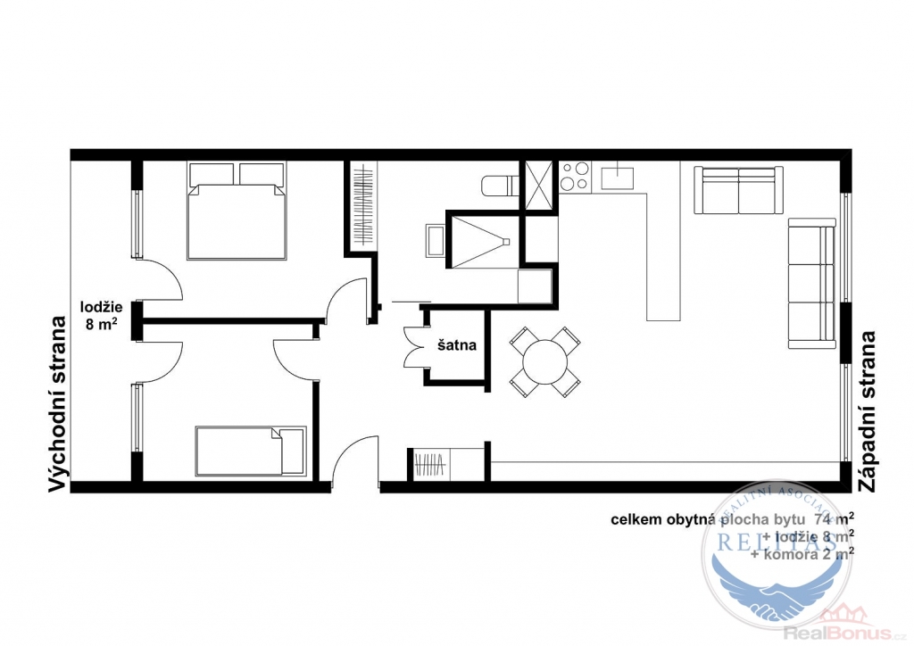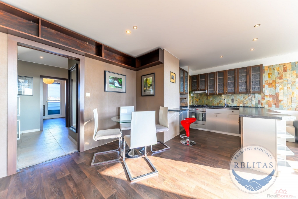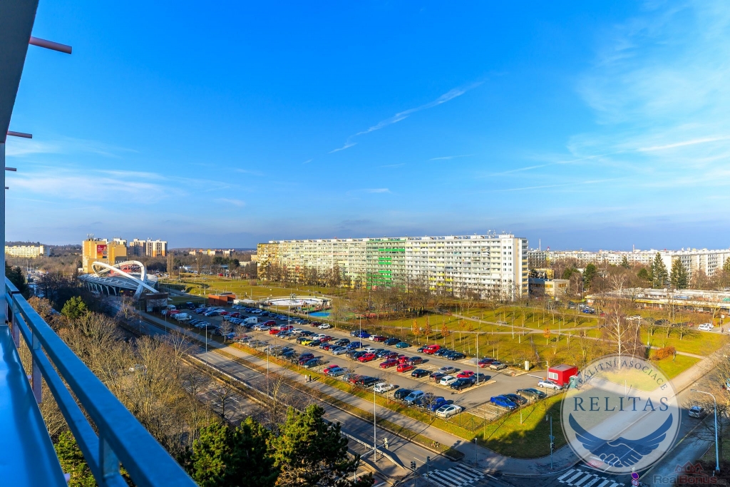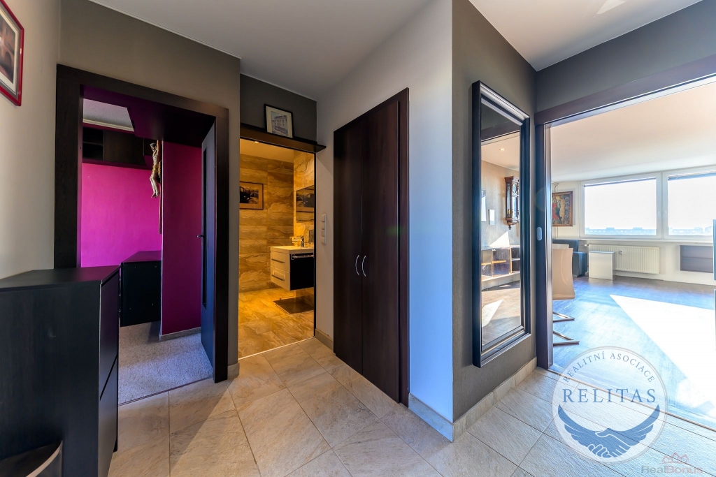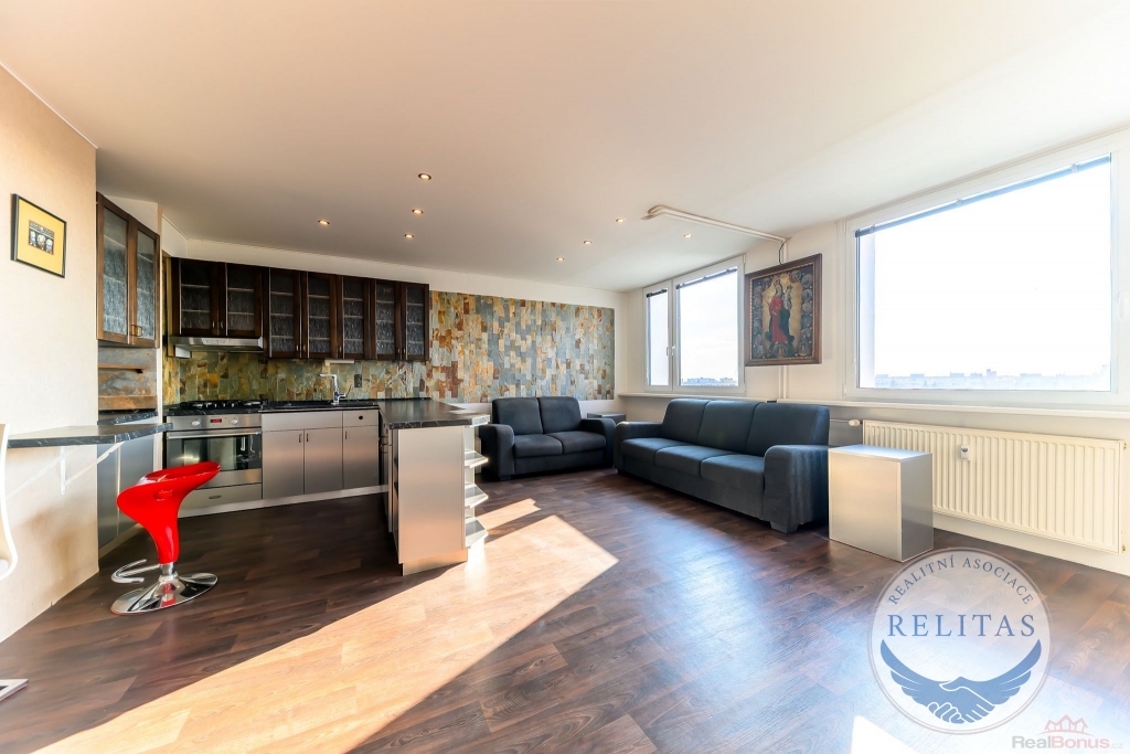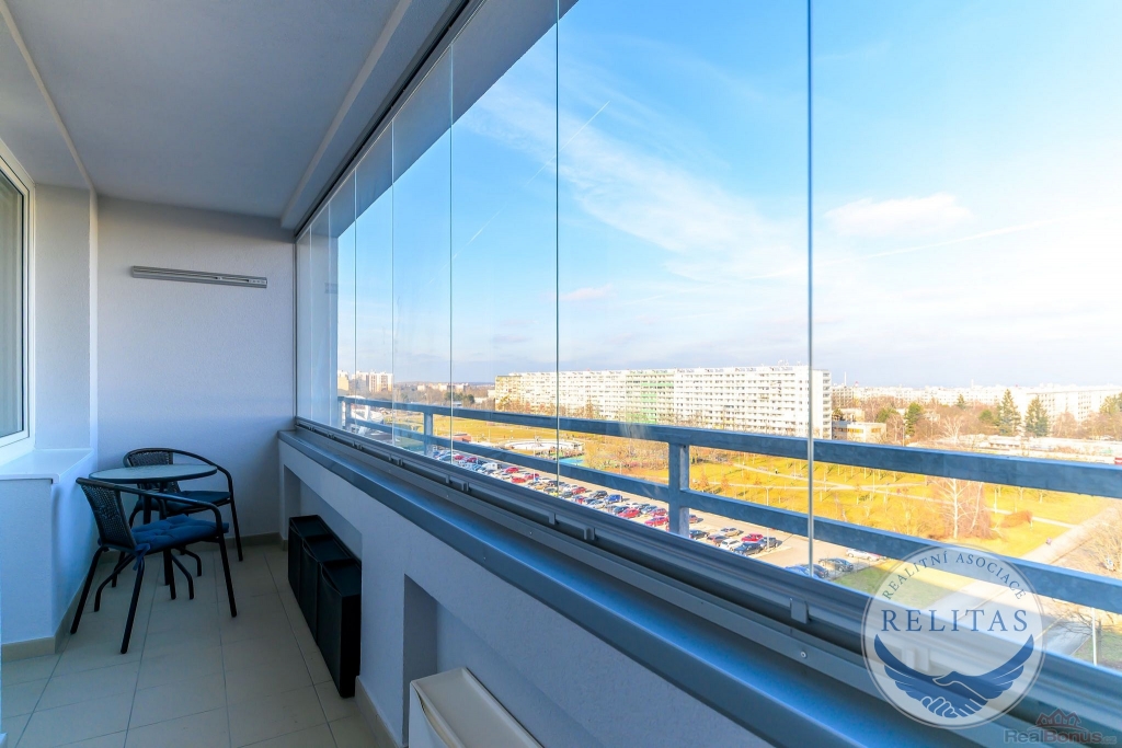 Byt v minulosti prošel kompletní rekonstrukcí, díky které nabízí praktické dispoziční řešení a vkusný interiér. Celková užitná plocha činí 82 m, z čehož podlahová plocha bytu zaujímá 74 m. K jednotce náleží také velkorysá lodžie o rozloze 8 m, která je přístupná z obou ložnic. Díky umístění v desátém patře nabízí lodžie naprosté soukromí a možnost pozorovat krásné východy slunce.