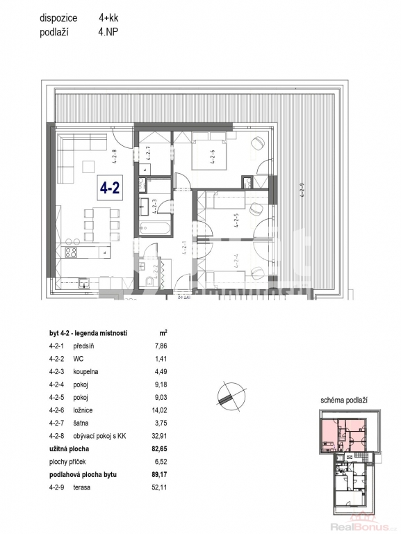 Bytová jednotka dispozice 4+kk je umístěná ve 4.NP. Podlahová plocha bytu je 89,17 m2 + terasa o ploše 52,11 m2. K bytu je možnost dokoupení sklepní kóje, parkovacího stání před objektem nebo krytého, parkovacího stání / garáže.