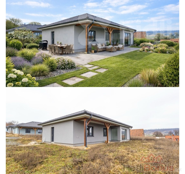Dispozičně dům nabízí obývací pokoj s kuchyňským koutem a přímým vstupem na terasu a zahradu, dále ložnici, dva samostatné pokoje se šatnou, koupelnu, samostatné WC a technickou místnost.