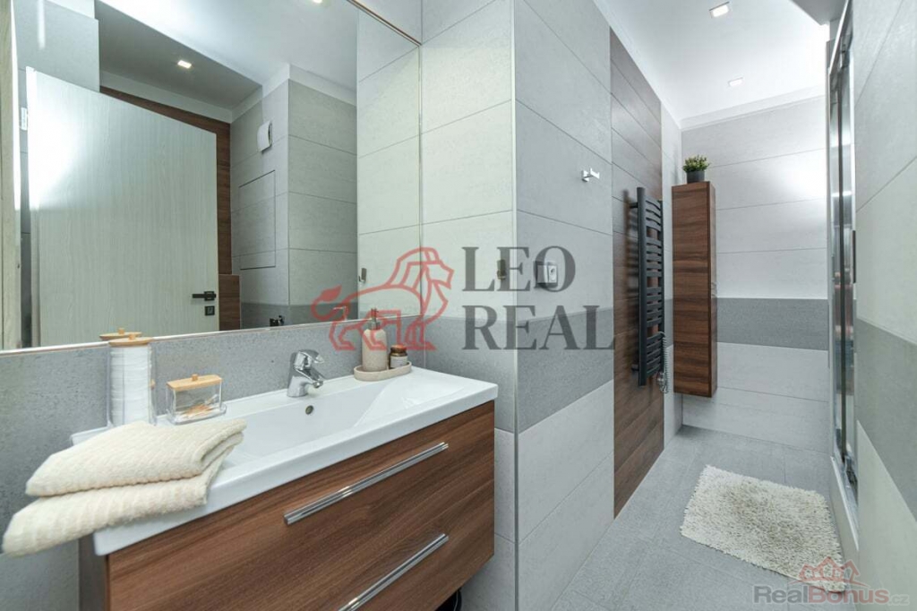 Koupelna je zděná, s moderním sprchovým koutem a WC. Najdete zde koupelnovou skříňku s umyvadlem, zrcadlo s osvětlením, elektrický topný žebřík a praktický prostor pro pračku i sušičku.