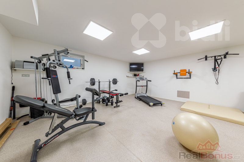 - V přízemí domu naleznete dvojgaráž, technickou místnost a velkou tělocvičnu s posilovnou.