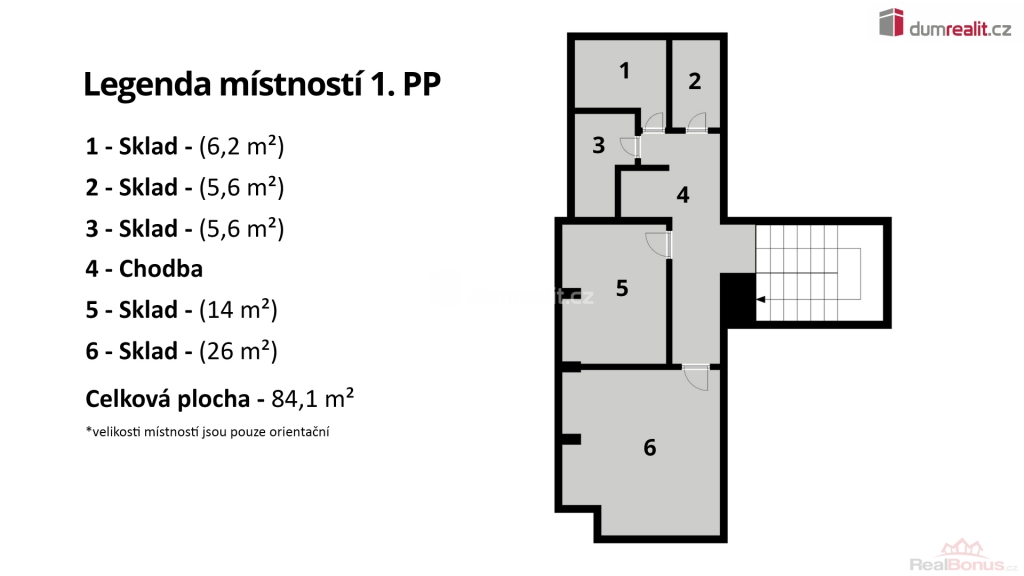 1.podlaží na ploše cca 214 m, kde je nyní prodejní prostor, kancelář s kuchyňským zázemím, skladovací prostory a další skladovací prostory v nynějším garážovém prostoru a samostatné sociální zázemí