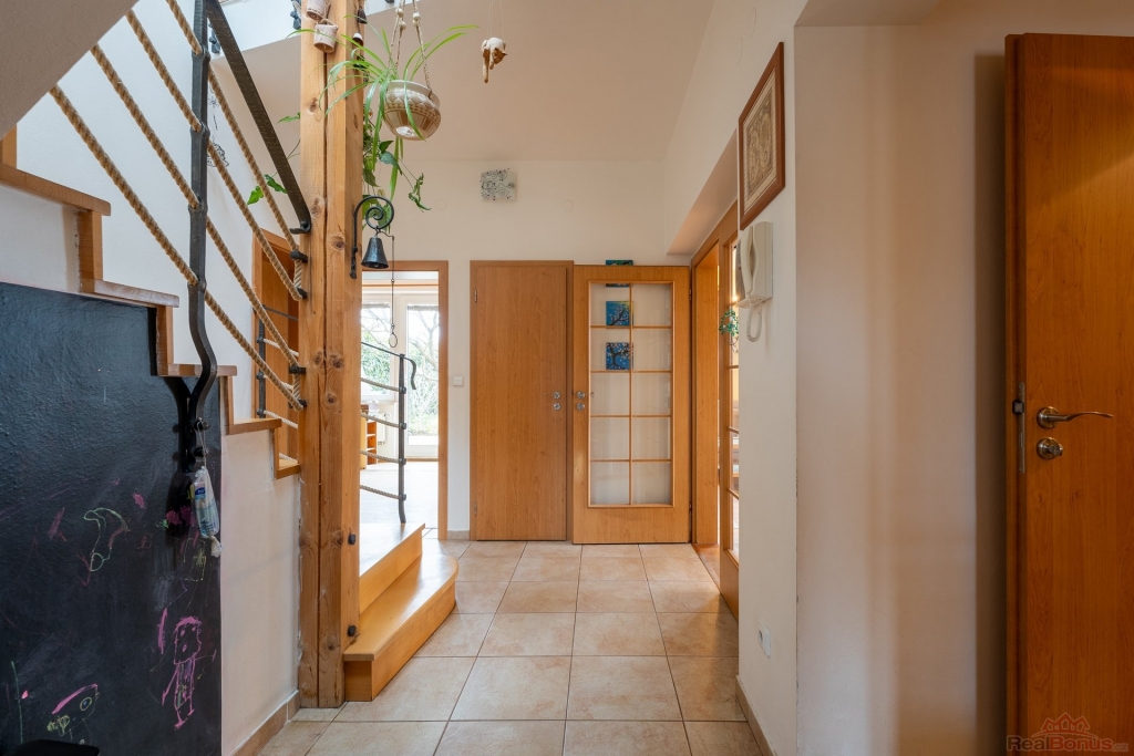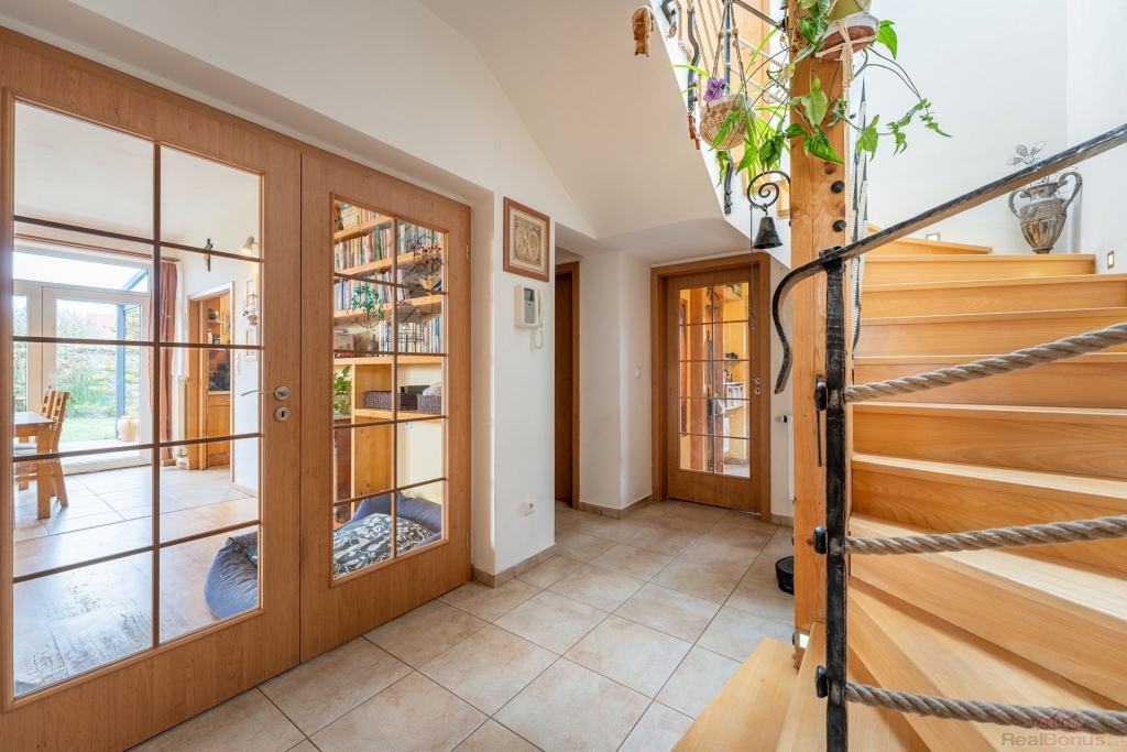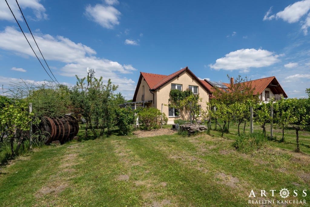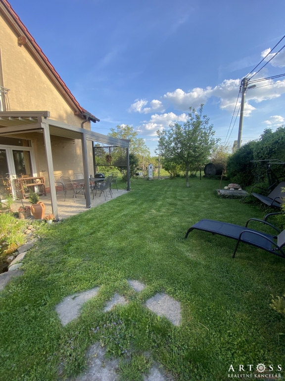 Velkorysý prostor, obytná část domu je orientována na jih, což zajišťuje dostatek denního světla. Jižním směrem je orientována i krásná zahrada s přírodním jezírkem, ovocnými stromy a vinnou révou. Je zde dostatek prostoru pro vybudování bazénu i hrací části pro děti. Ideální místo pro rodinu s dětmi.