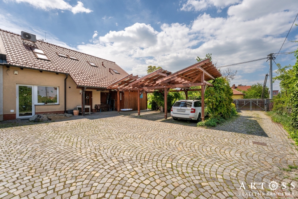 Velká zahrada a parkování ? zahrada o rozloze 651 m2, v přední části domu je kryté parkování pro více aut, kde je možné umístit třeba i karavan.