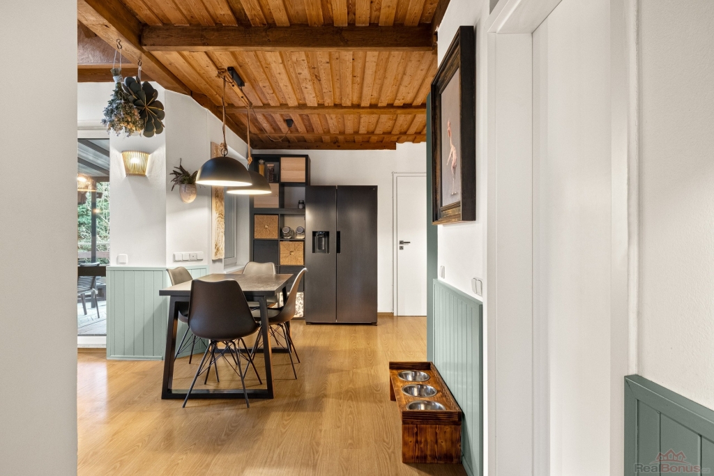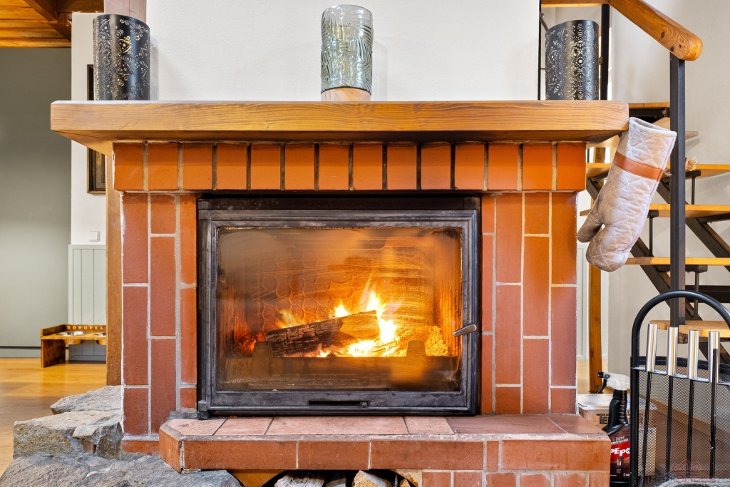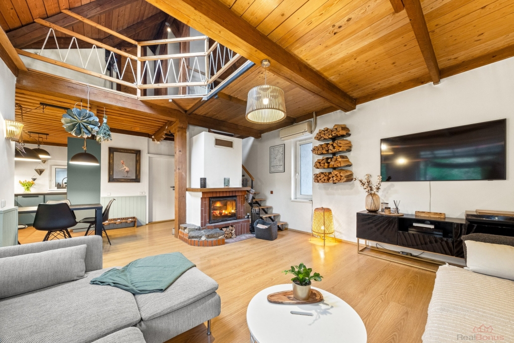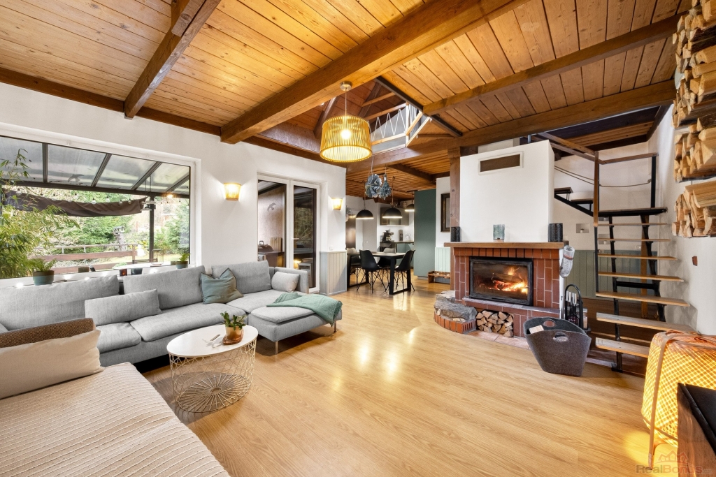 Vstupní zádveří nabízí prostor pro šatnu a navazuje na hlavní obytnou část domu s dominantním krbem, který tvoří přirozené centrum celého interiéru. Velkým estetickým i praktickým prvkem je otevřené celodřevěné patro, které dodává domu charakter a pocit vzdušnosti. Kuchyně je otevřená a plynule propojená s obývacím pokojem, odkud se dostanete do ložnice. V přízemí se dále nachází koupelna po nedávné rekonstrukci.