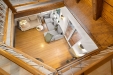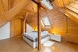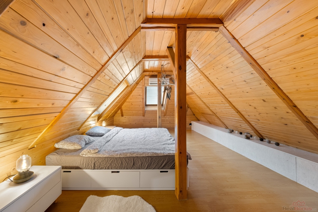 Schodiště kolem krbu vás zavede do podkroví, kde se při vstupu otevírá dřevěný prostor vhodný jako pracovna, relaxační zóna nebo místo pro klidné posezení. Navazuje na něj samostatný prostorný pokoj s menší šatnou a dalším praktickým úložným prostorem.