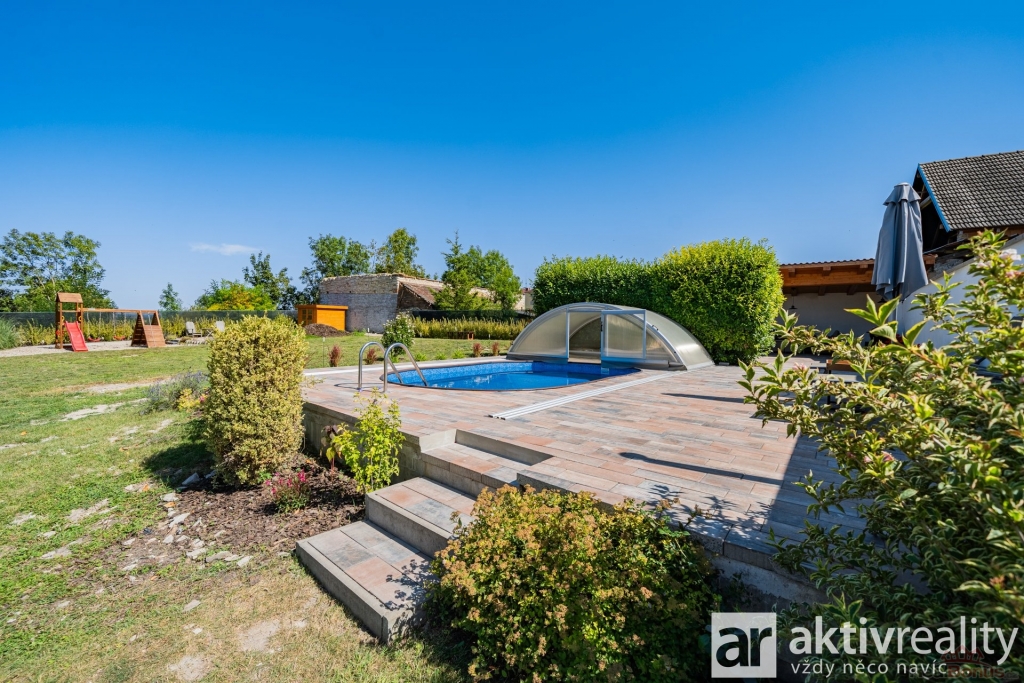 Zahrada poskytuje dostatek soukromí a relax. V tomto roce byl vybudovaný bazén 5,25 x 3,2 x 1,50 , v roce 2024 byla postavena pergola, okap sveden do podzemní plastové nádrže ke sběru vody, natažena elektřina a voda, položena nová dlažba. Na pozemku se dále nachází dětské hřiště, zahradní posezení, dřevěný zahradní domek na nářadí a původní zrekonstruovaná budova cca 20 m2, kde najdete letní kuchyň a místnost-ložnice pro návštěvy.