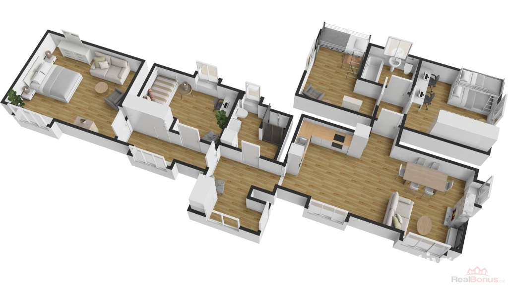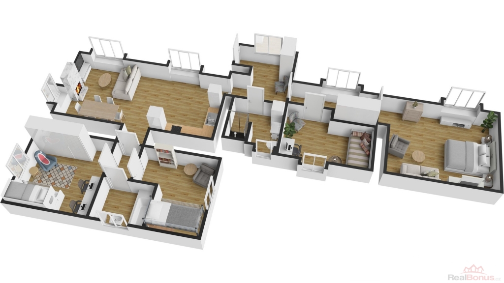 Dispozice domu je znázorněná v půdorysu a celý dům si můžete projít prohlídkou v matterportu.