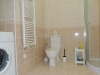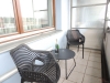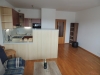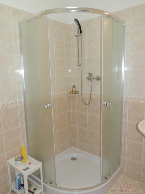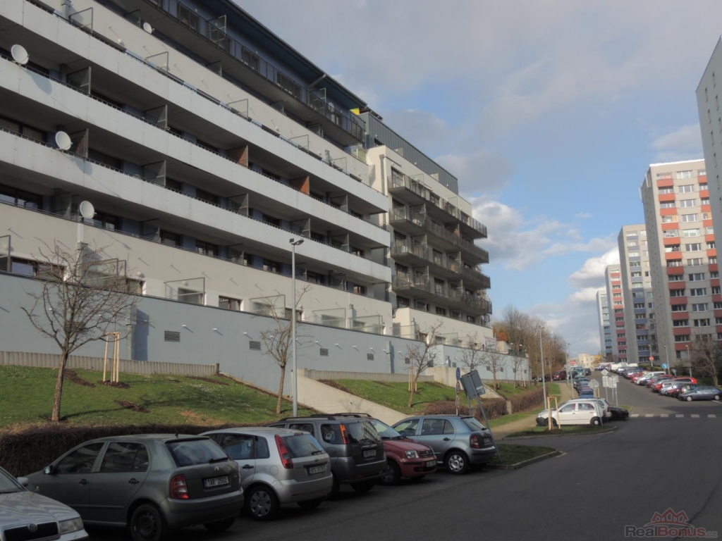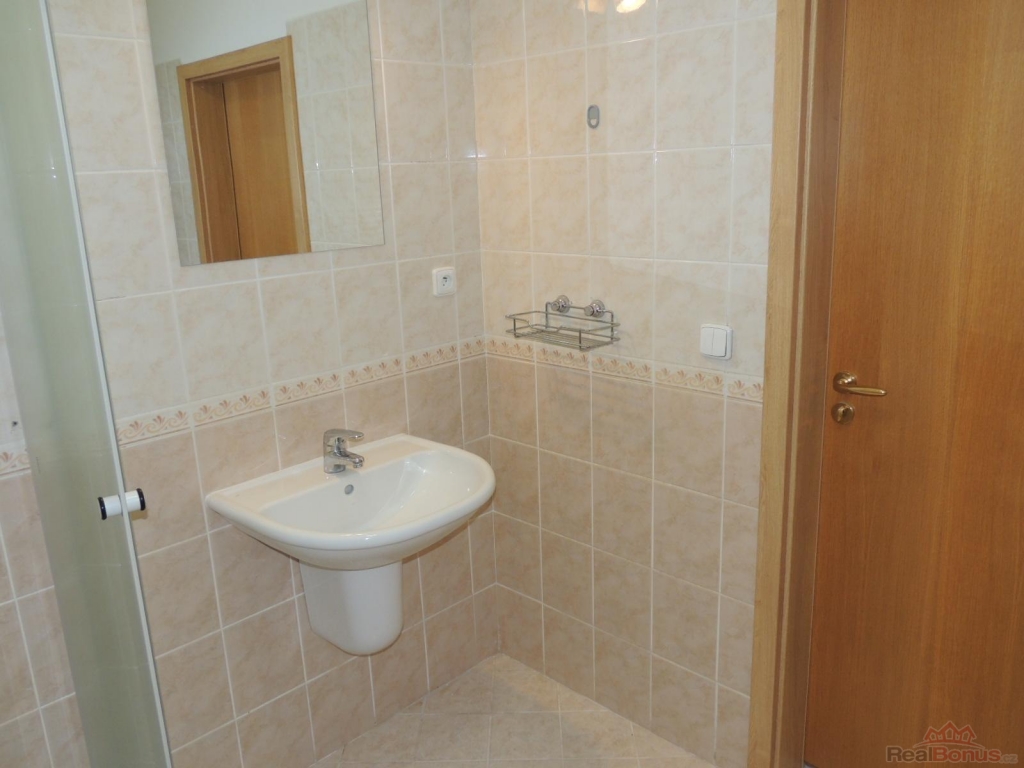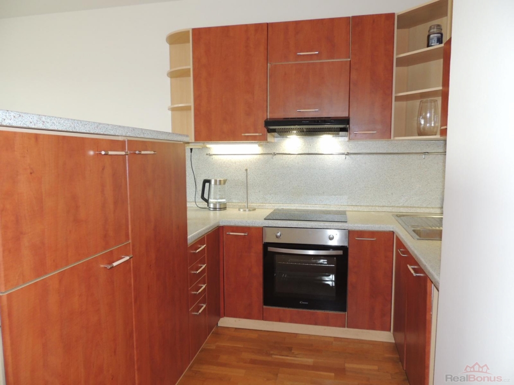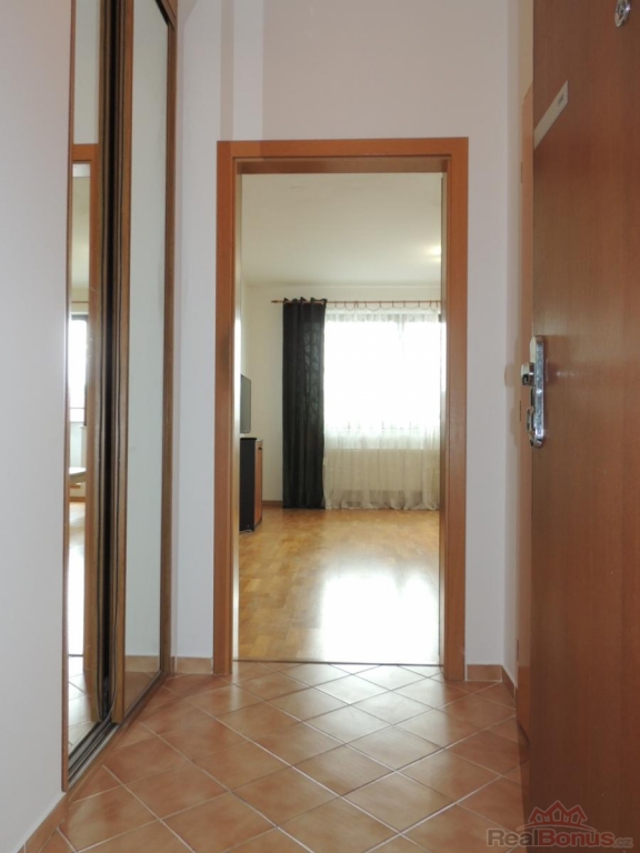 Při vstupu do bytu se nachází předsíň s vestavnou skříní, prostorná koupelna se sprchovým koutem, umyvadlem, WC a pračkou. Dále se vchází do obytné místnosti s kuchyňským koutem, který je plně vybaven vestavnou lednicí s mrazákem, multifunkční el. troubou, varnou deskou, myčkou, mikrovlnnou troubou a digestoří. V pokoji je dřevěná podlaha, rozkládací pohovka, stolek, skříňka, TV. Z pokoje je vstup na terasu s posezením, která je umístěna na jižní stranu. Součástí pronájmu je sklep a garážové stání v suterénu domu, odkud vyjedete pohodlně výtahem až k bytu.