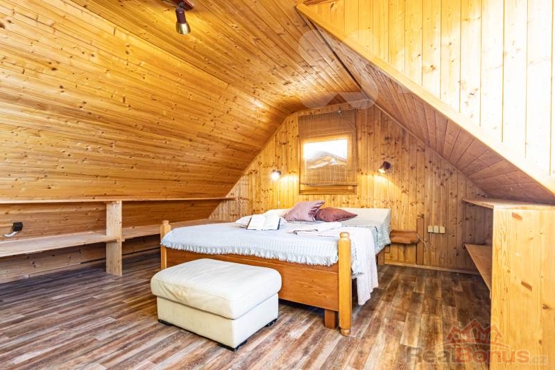 Interiér srubu tvoří útulný obývací pokoj, ložnice a kuchyňský kout. Koupelna je vybavena sprchovým koutem, toaletou a bojlerem pro ohřev vody. Pro tepelný komfort v chladnějších měsících jsou v celém objektu osazena plastová okna. Vytápění spolehlivě zajišťují kamna na dřevo, která srubu dodávají tu správnou atmosféru, doplněná o elektrické přímotopy. Srub je ve velmi dobrém technickém stavu, zastřešen sedlovou střechou s pálenou taškou a připraven k okamžitému užívání. Technické napojení zahrnuje obecní vodovod, elektřinu a vlastní čističku odpadních vod.
